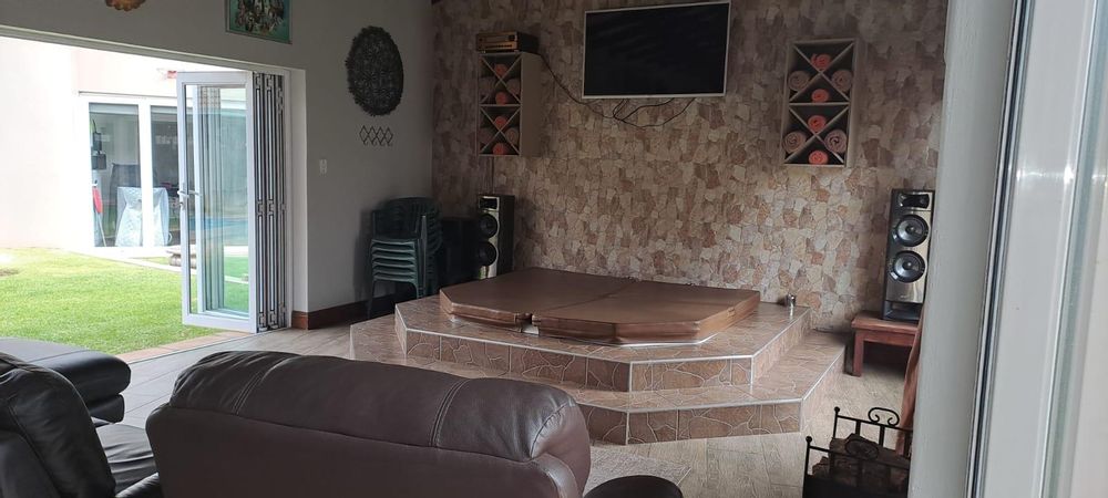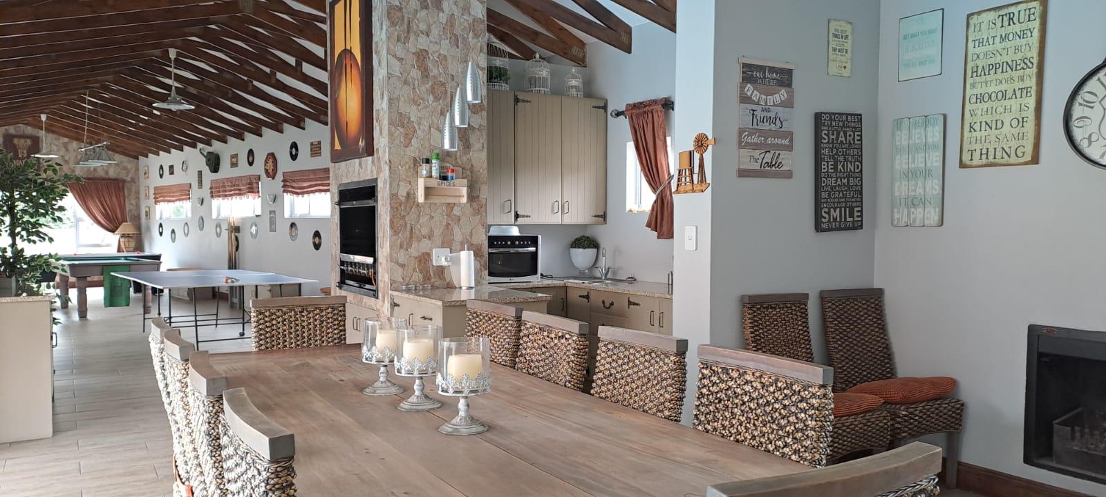 Upon entering the entrance hall, you'll be immediately captivated by the spacious entertainment area. The indoor-outdoor space features a built-in bar and custom-made gas braai, with views of the lush garden and sparkling pool adding to the ambiance.