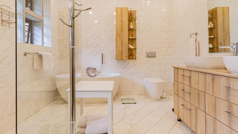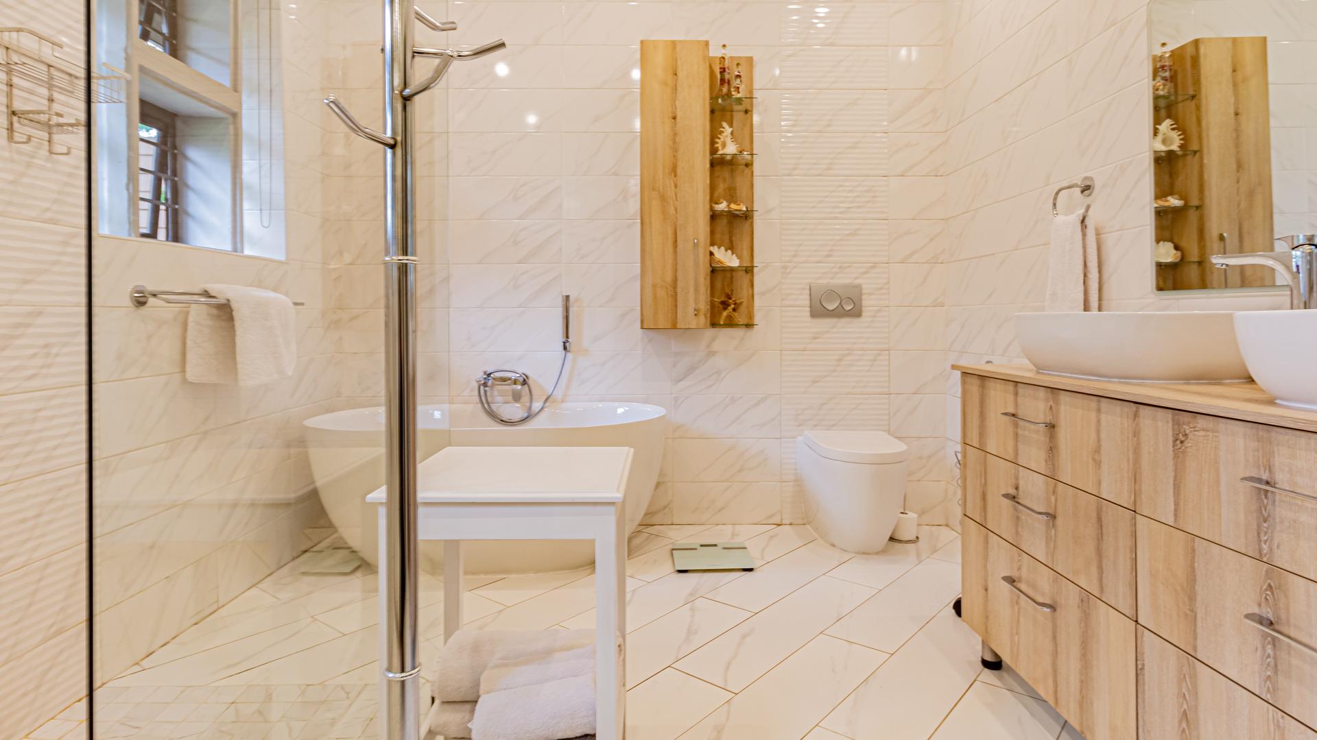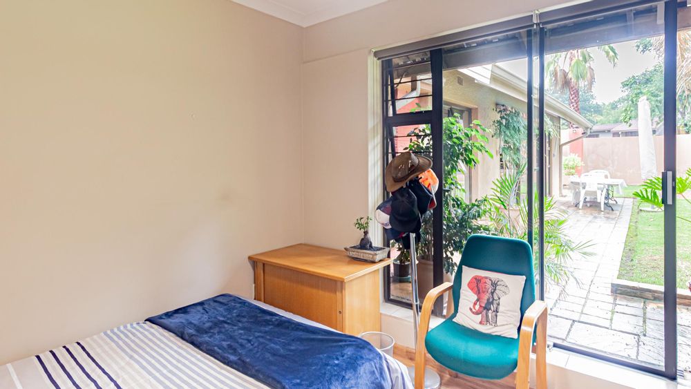 The residence boasts 4 generously sized bedrooms, each with built-in cupboards and laminated flooring. The main bedroom features an elegant en-suite bathroom with top-quality finishes, while one of the other bedrooms offers direct access to the pool area via a sliding door.