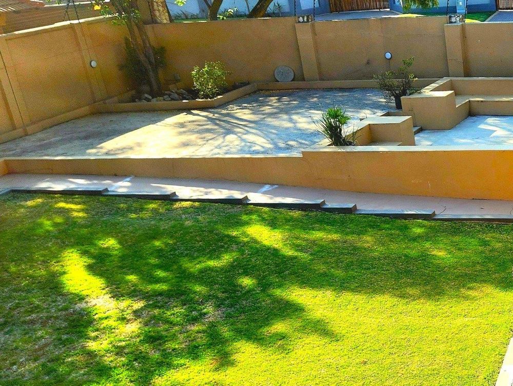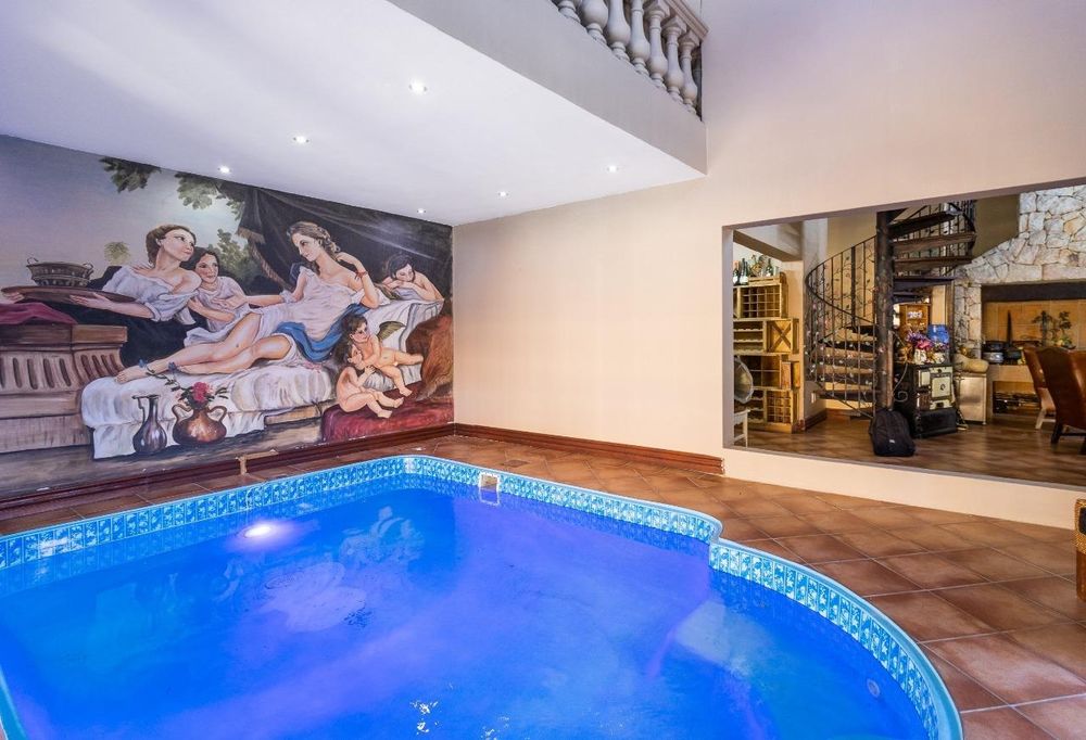The outdoor areas offer a serene escape with a natural lawn complemented by low-maintenance astro under a magnificent tree. Whether hosting gatherings, enjoying children's playtime, or seeking quiet reflection, this backyard provides it all. The generous covered patio with a built-in braai enhances your living space for effortless indoor-outdoor entertaining. The front garden is equally impressive, featuring a lush lawn, cozy boma, and an entertainer’s dream patio for unforgettable evenings under the stars. This home also features both indoor and outdoor swimming pools for added luxury.