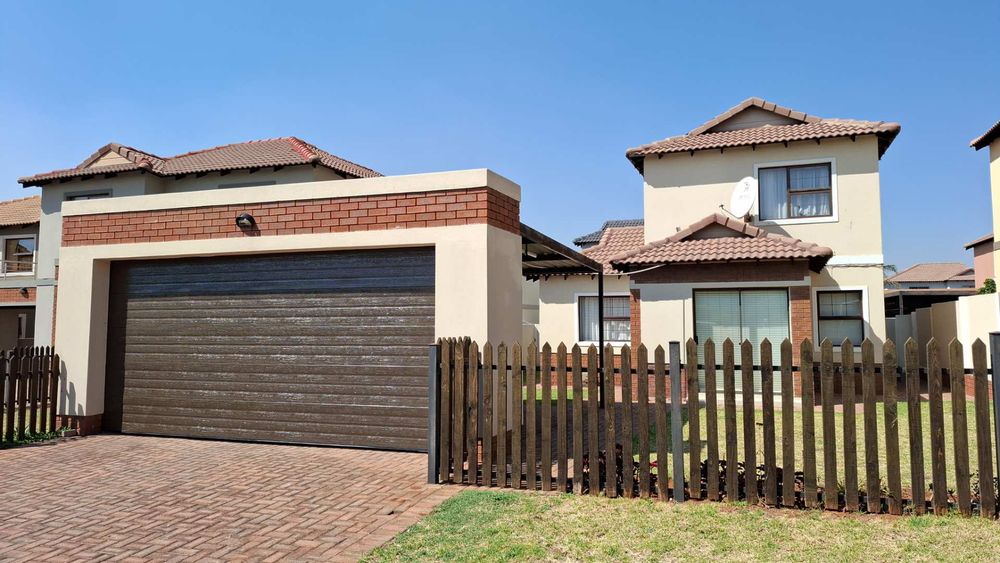 Double -story cluster home offers lounge with porcelain tiles, enclosed porch with sliding doors to garden. Open plan kitchen, with hob and under counter oven.