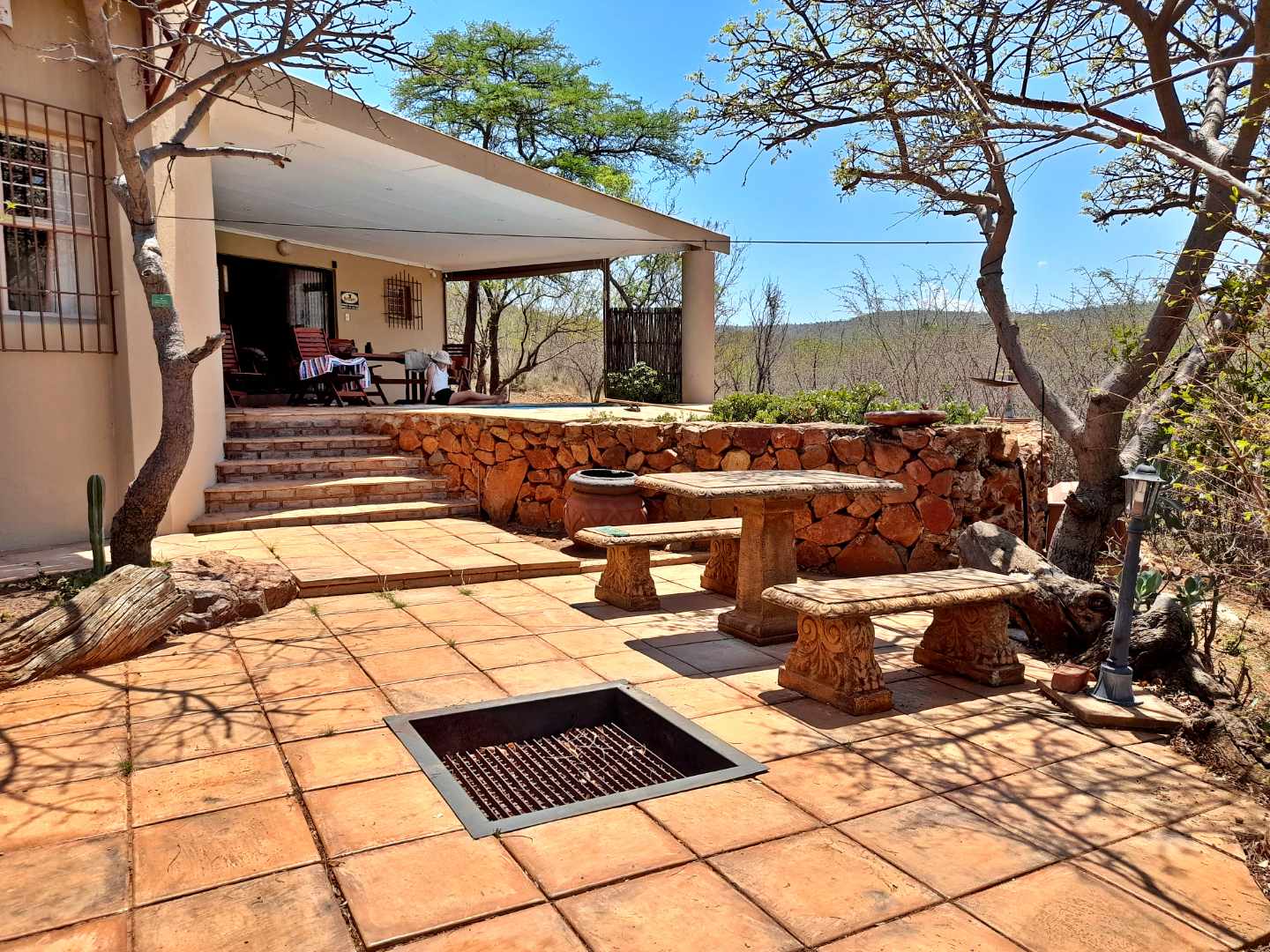 Step outside to find a paved pathway leading to a cozy fire pit, perfectly set amidst the bushveld nature. The property also includes a double covered carport for convenient parking.