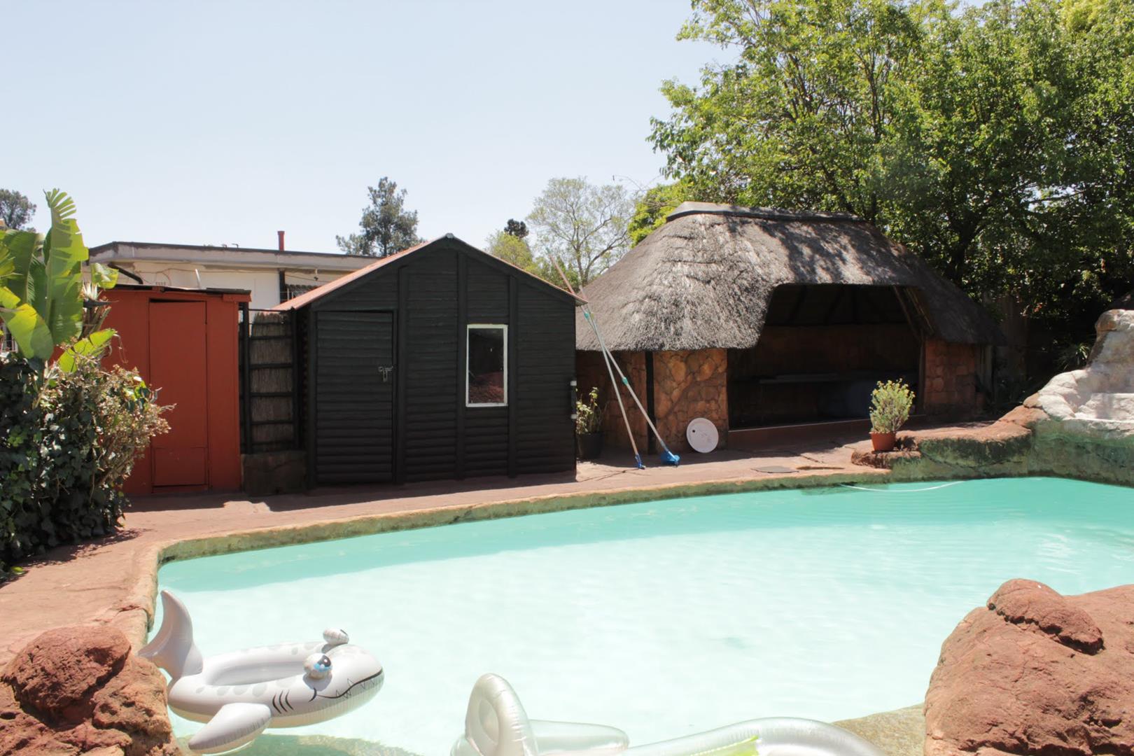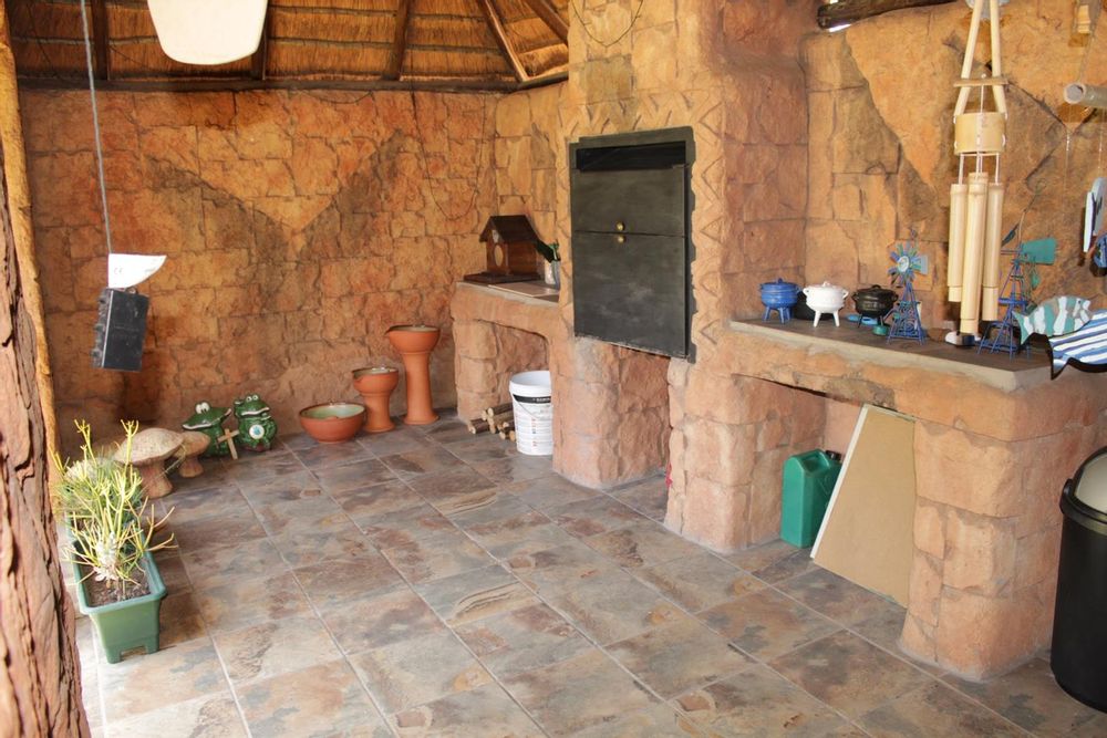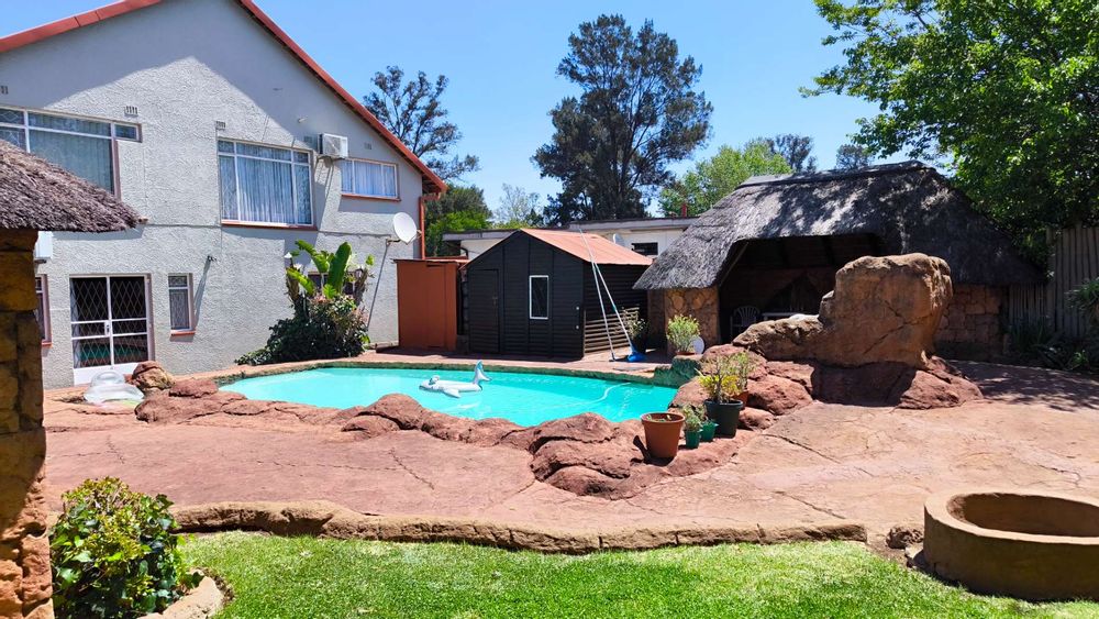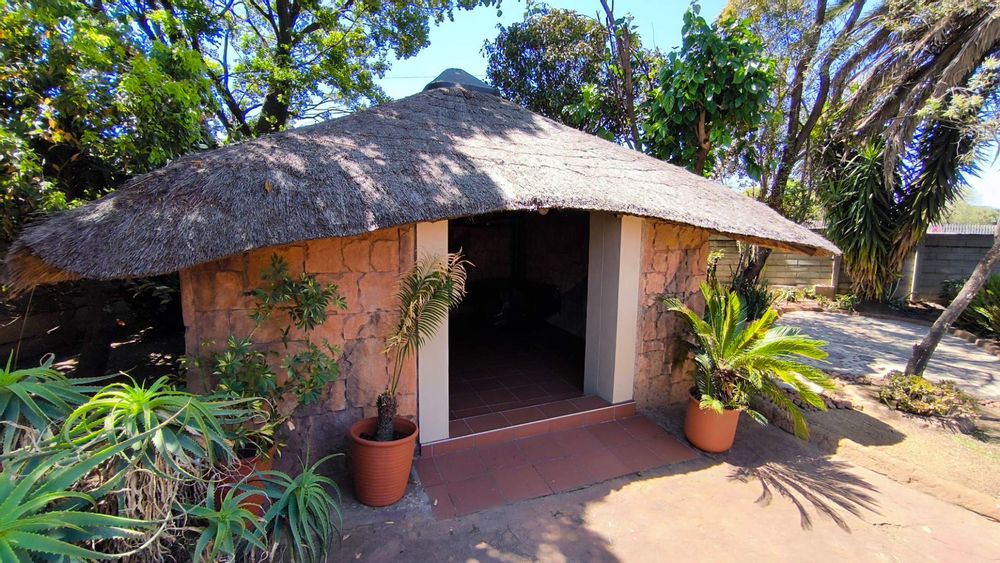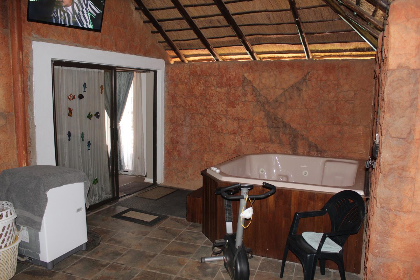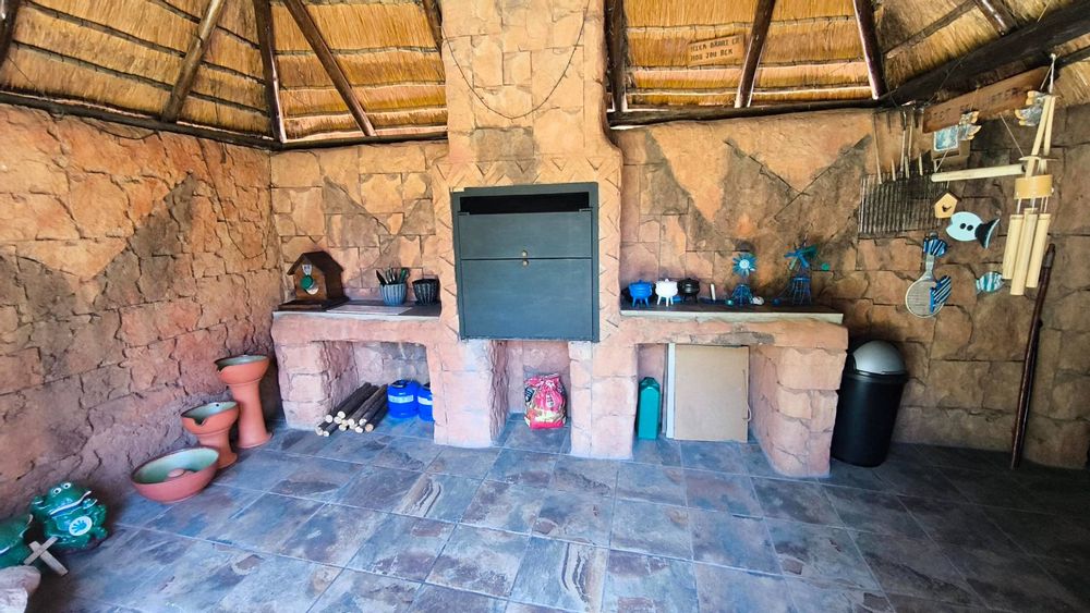 The main house boasts 4 generously-sized bedrooms, (3 beds have en-suite bathrooms!) and 4 bathrooms to accommodate all your needs. Aircons in 2 bedrooms - (12 000 btu each) The large lounge area, with a built-in jetmaster & air-con (18 000 btu) is a true highlight, opening up to a spectacular rock-art themed pool and braai area with jacuzzi.. With 3 thatched entertainment rooms, this outdoor space is perfect for hosting unforgettable gatherings with family and friends.