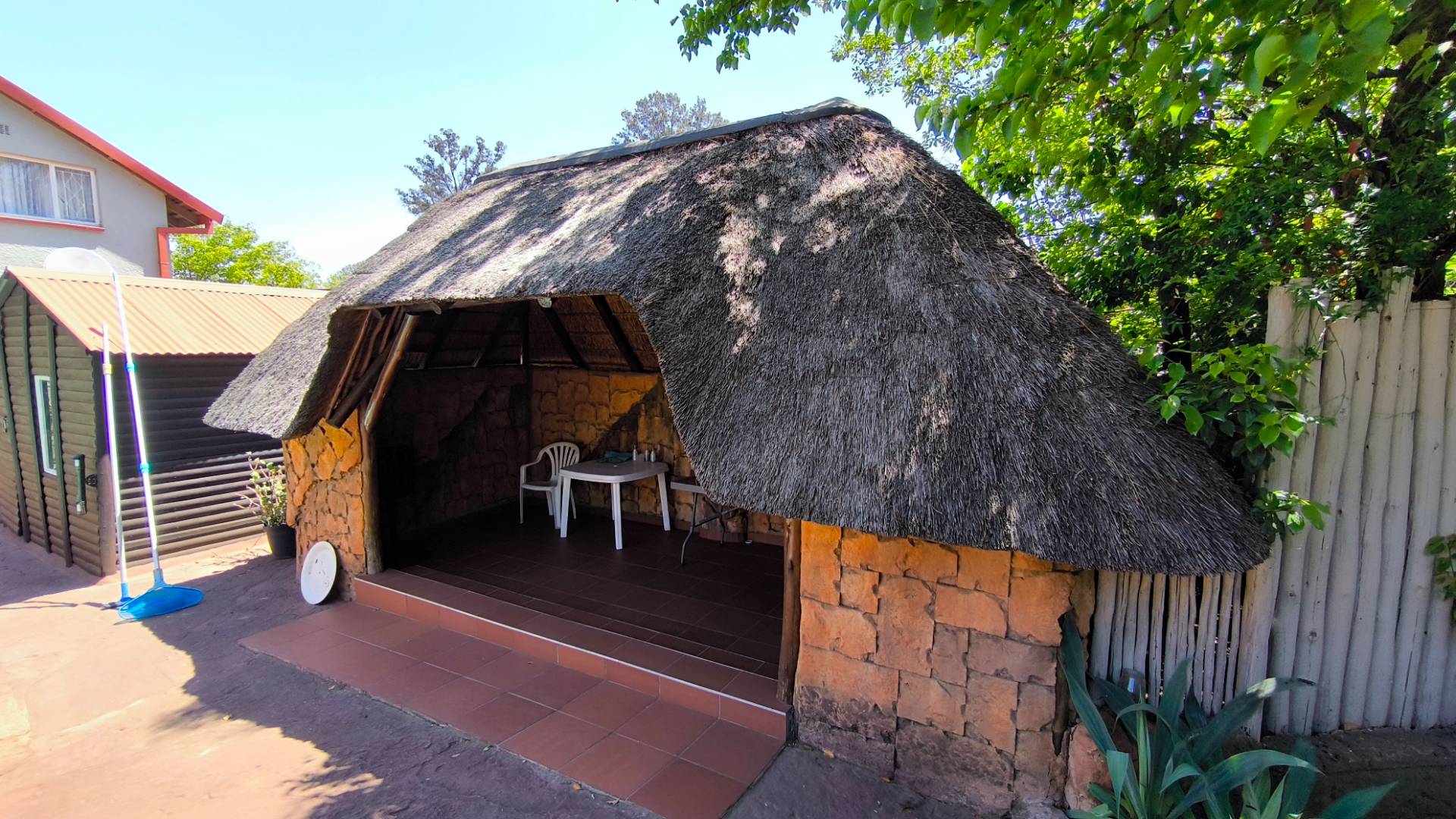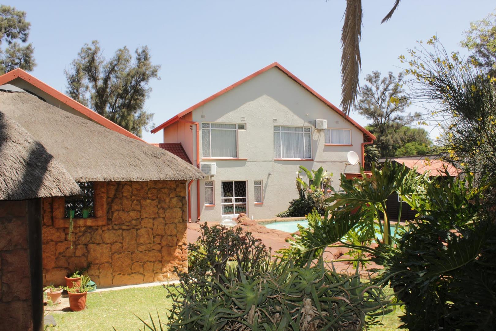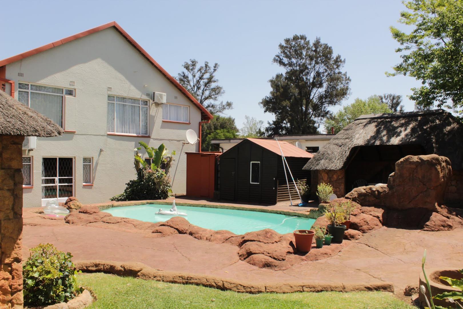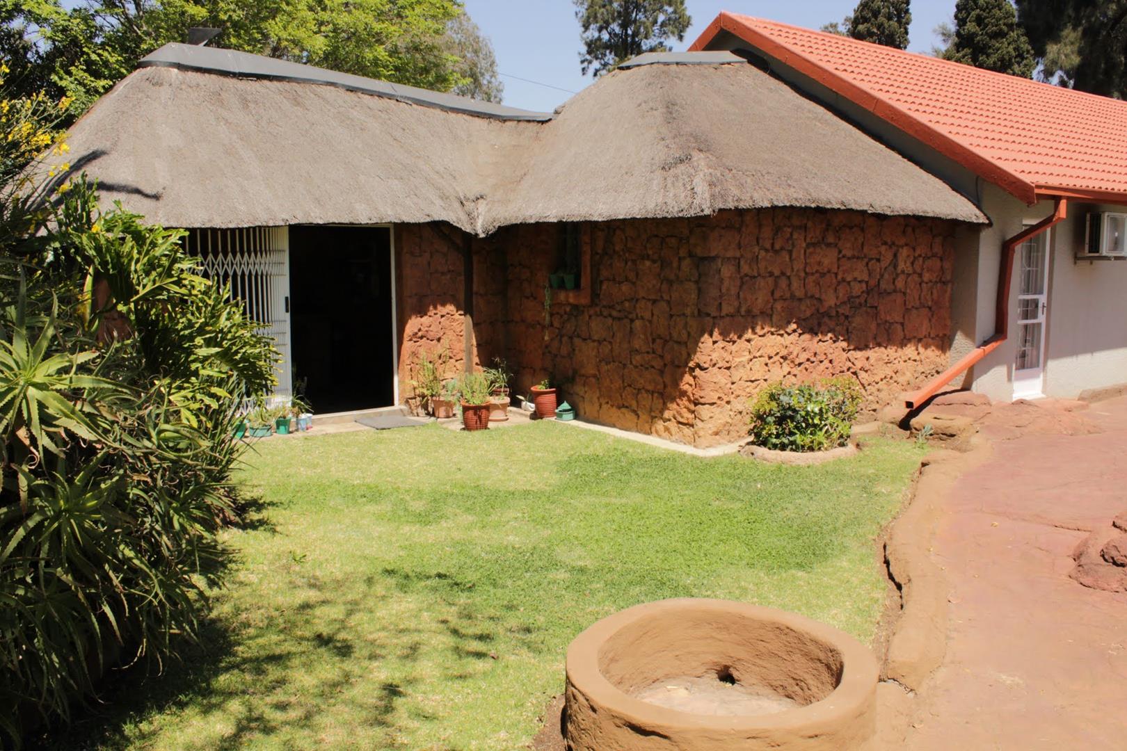 The main house boasts 4 generously-sized bedrooms, (3 beds have en-suite bathrooms!) and 4 bathrooms to accommodate all your needs. Aircons in 2 bedrooms - (12 000 btu each) The large lounge area, with a built-in jetmaster & air-con (18 000 btu) is a true highlight, opening up to a spectacular rock-art themed pool and braai area with jacuzzi.. With 3 thatched entertainment rooms, this outdoor space is perfect for hosting unforgettable gatherings with family and friends.