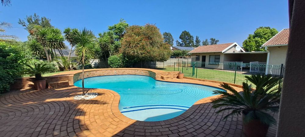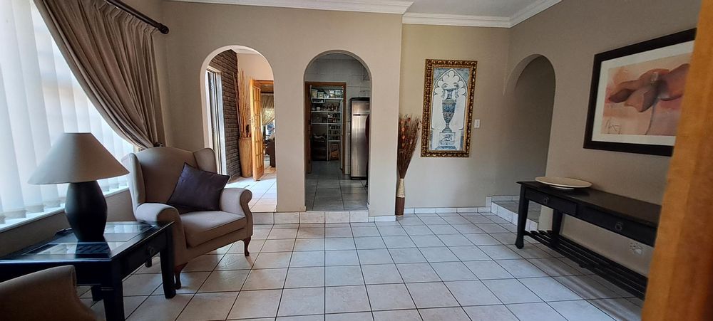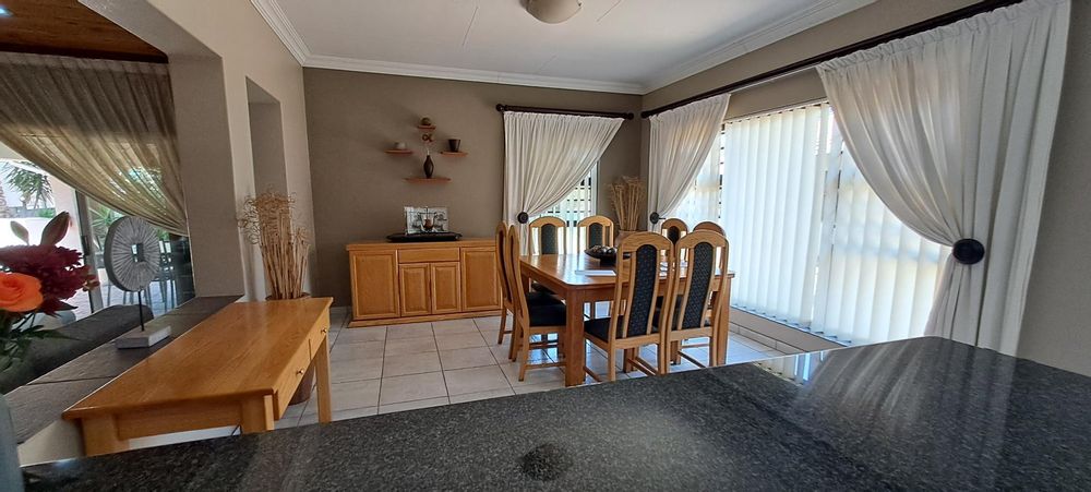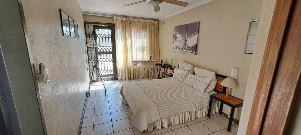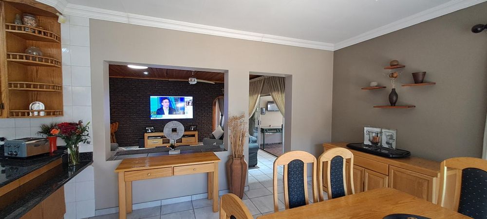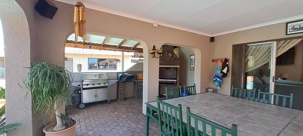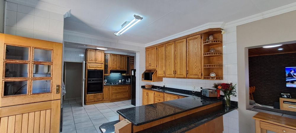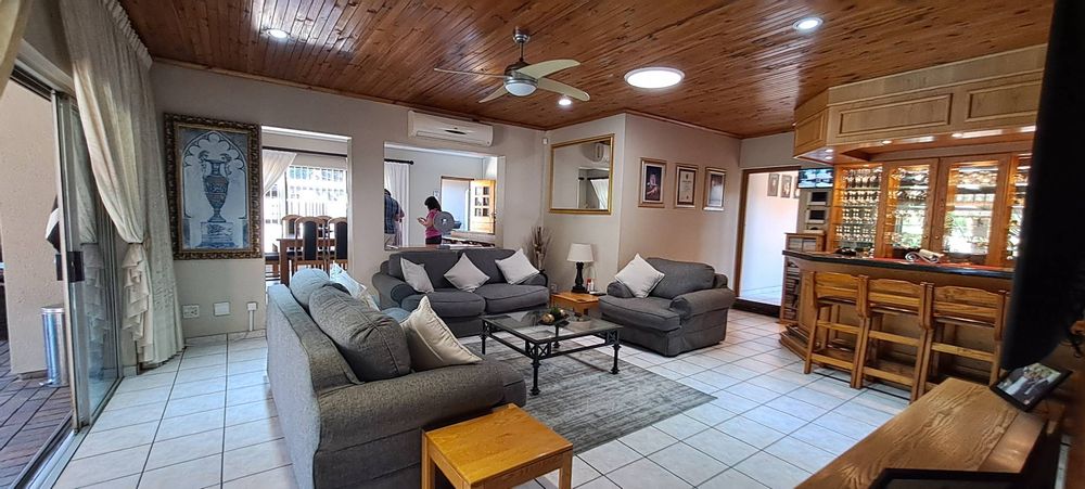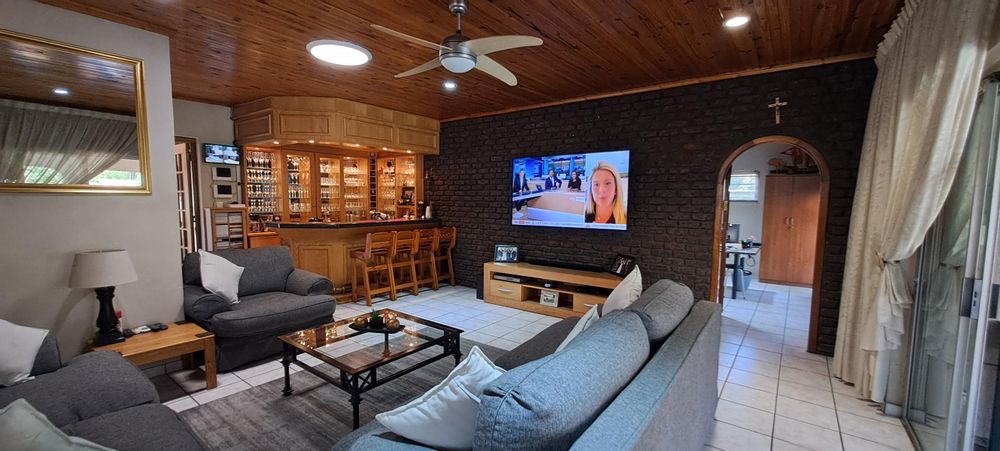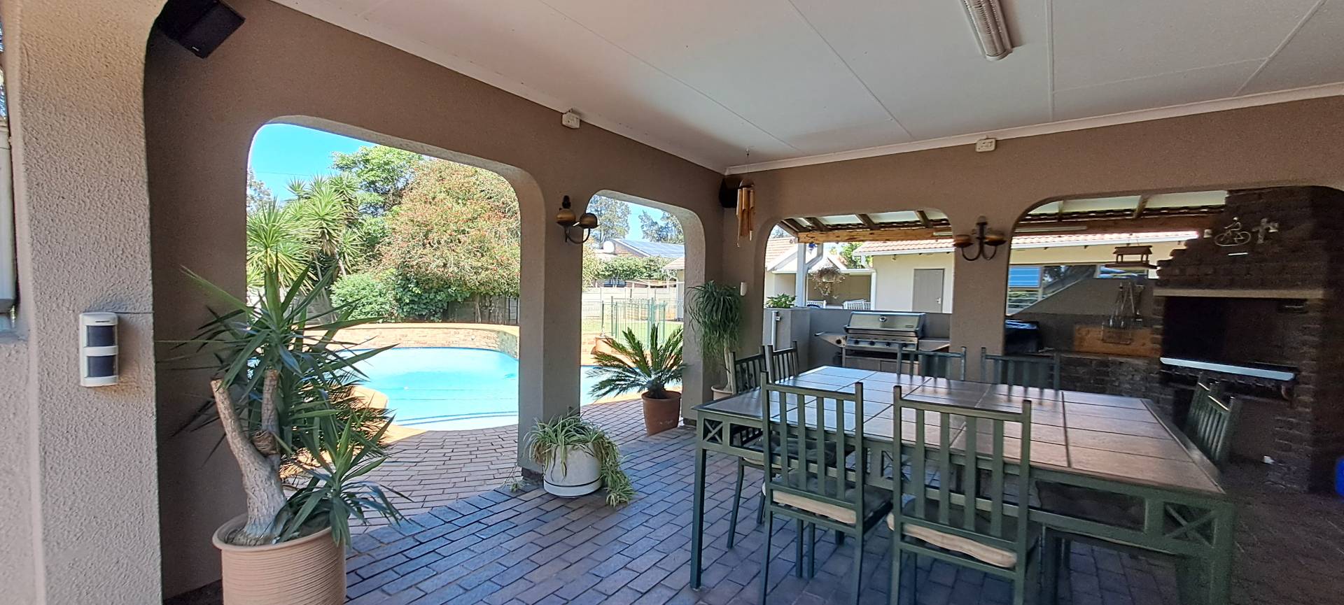The stunning family room is designed for comfort and entertainment, leading onto the entertainment area with views of the manicured garden and sparkling pool. A solid oak-fitted bar adds a touch of sophistication. The family room opens onto a large covered patio with a built-in Braai, perfect for alfresco dining.