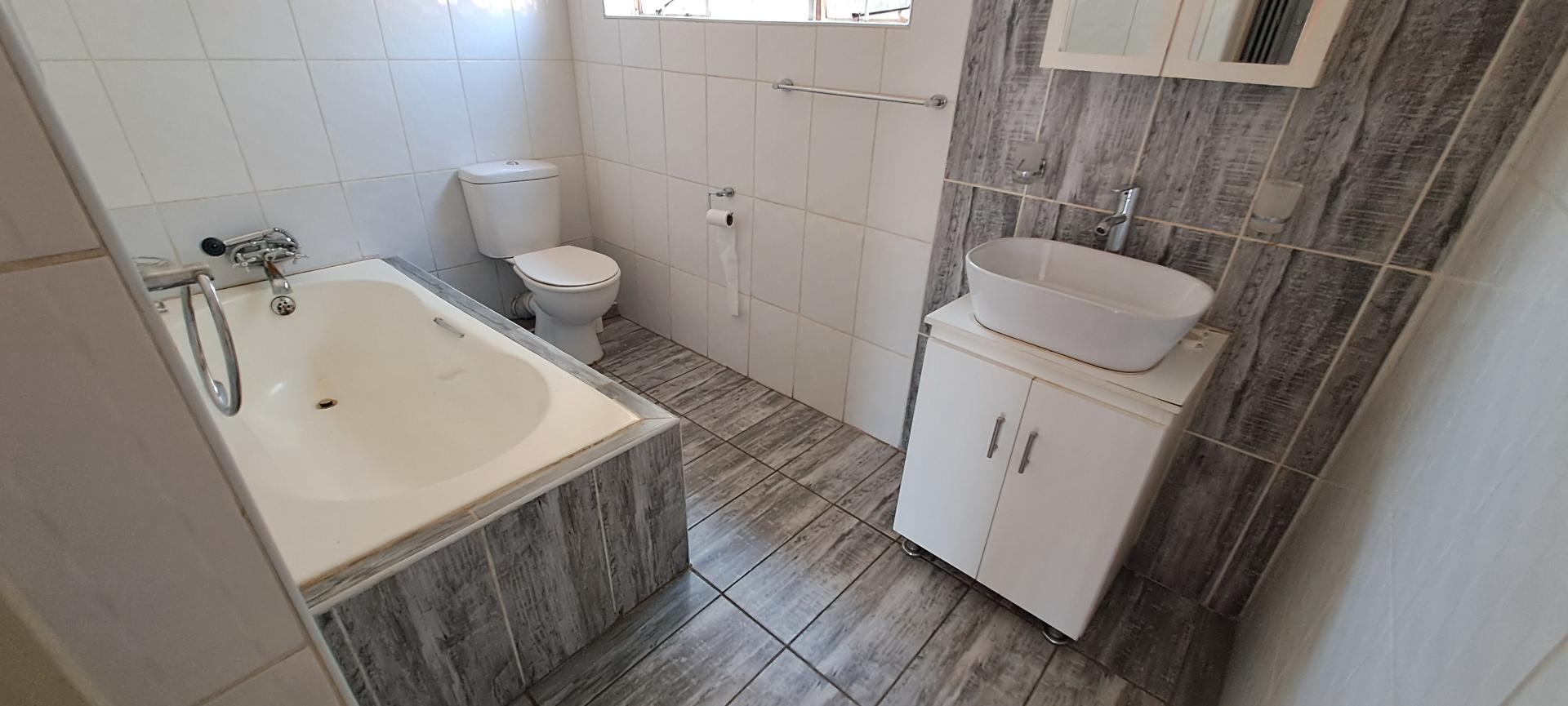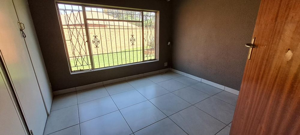 The flatlet includes two well-sized bedrooms with tiled floors and curtain rails, although it does not have built-in cupboards. Burglar bars are installed for added security.
