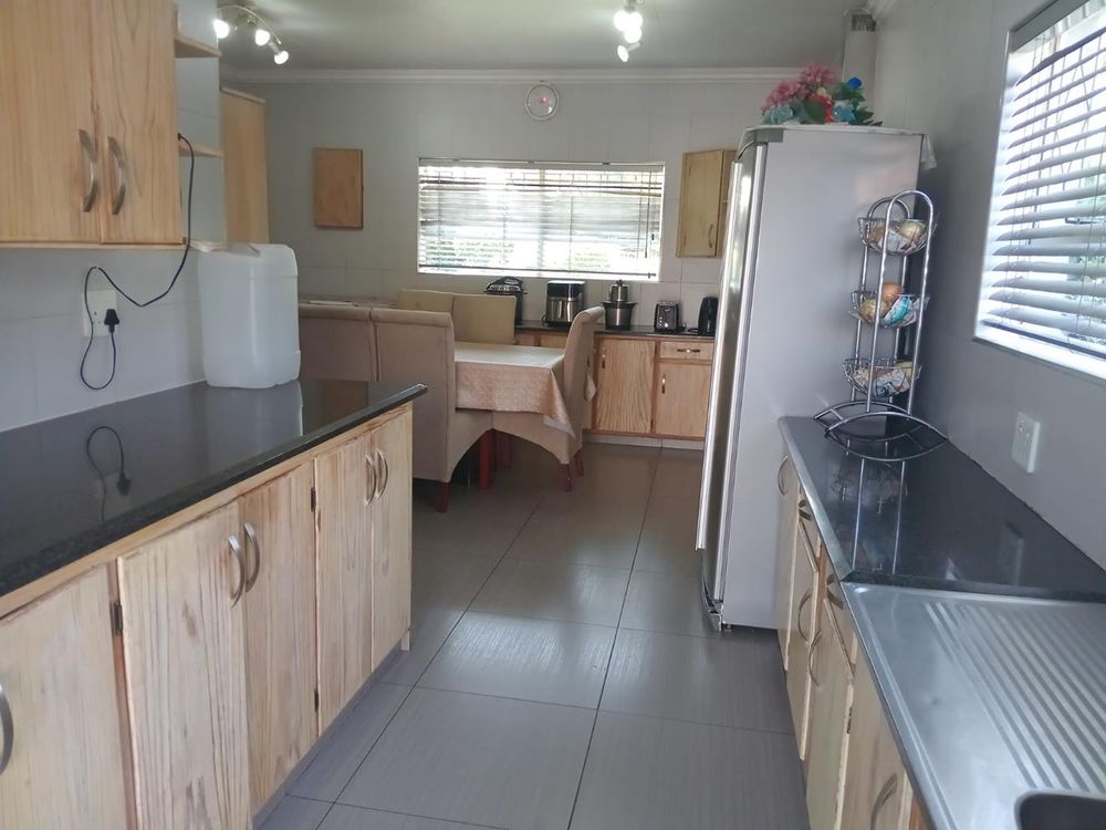 This impressive home offers four generously sized bedrooms, each with built-in cupboards and laminated flooring. Additionally, there is a separate study, perfect for remote working or a quiet reading nook. The property is serviced by two well-appointed bathrooms; the first includes a bath, shower, basin, and a separate toilet, while the main en-suite features a bath, basin, and toilet.