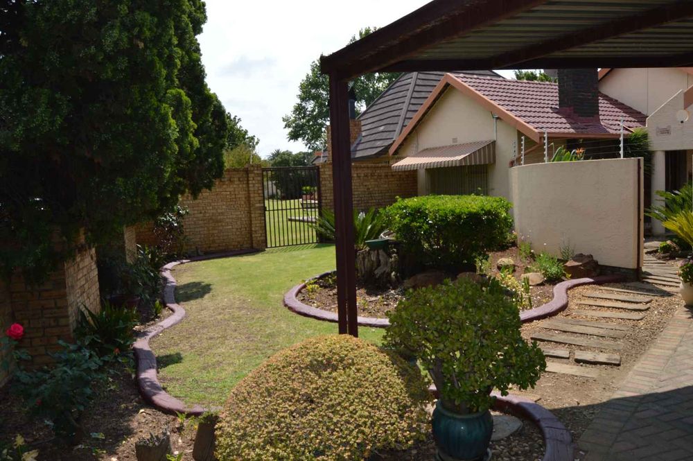 The property features a large, enclosed patio with three sliding doors, trellidoors, and two built-in braais, all overlooking a beautifully landscaped garden and inviting swimming pool—perfect for entertaining guests or enjoying peaceful family gatherings.