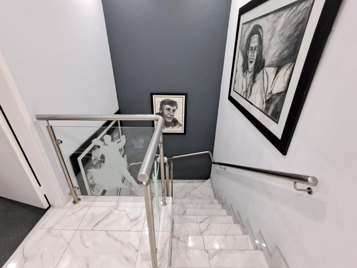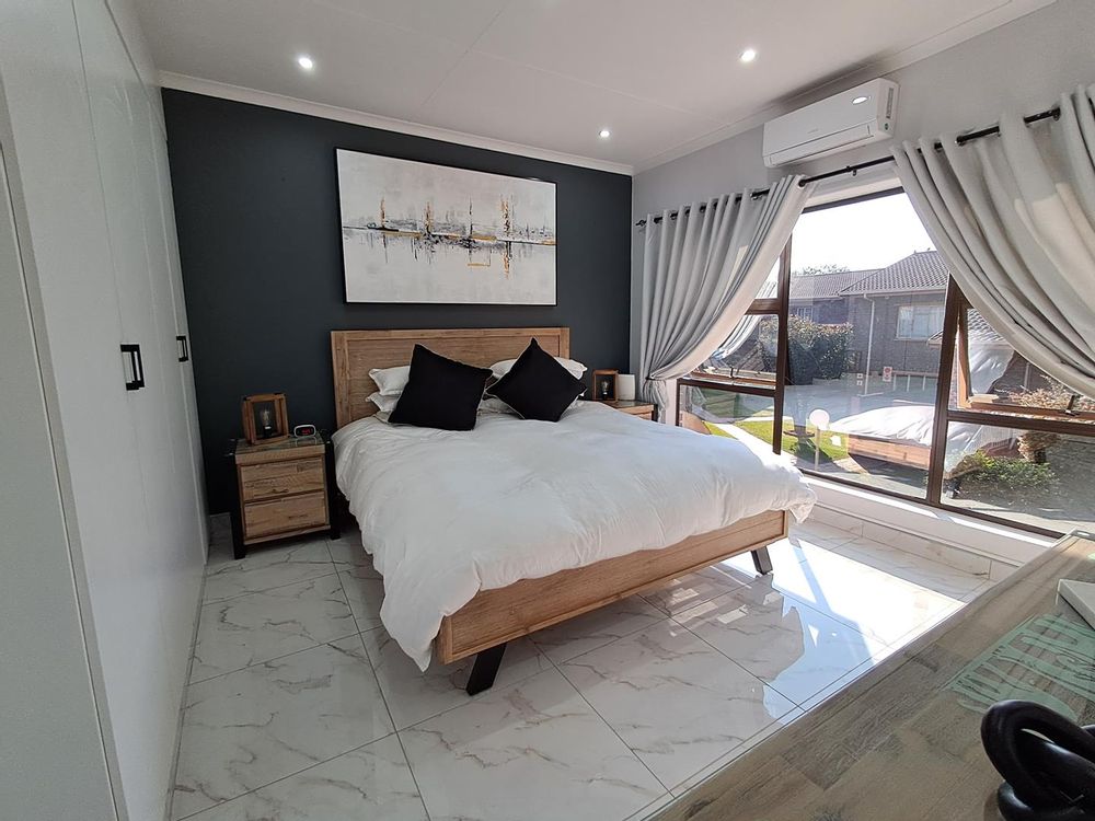 Upstairs, discover three generously sized bedrooms. The main bedroom includes a beautifully designed en-suite bathroom. It also features built-in cupboards, downlights, and air conditioning, offering a serene retreat for relaxation.