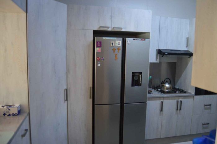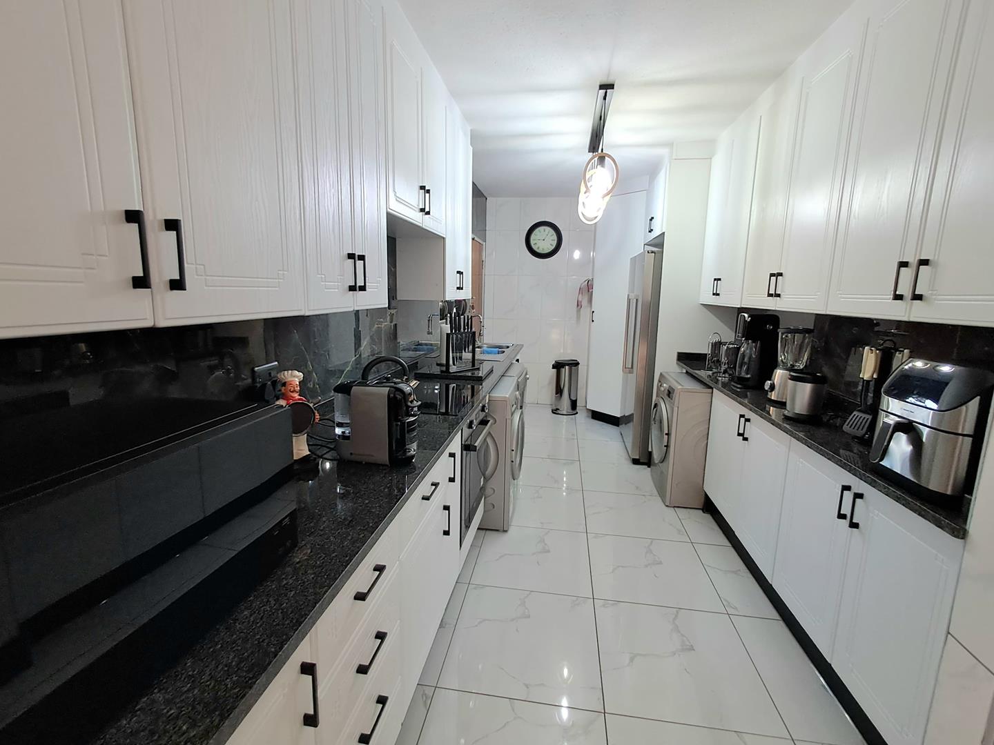 The lounge boasts a sophisticated ambiance with chandeliers and an air conditioning unit, leading out to a private garden perfect for outdoor enjoyment. The expansive kitchen is a chef's dream, featuring chandeliers, modern finishes such as granite countertops, and an extended breakfast nook. Thoughtfully designed kitchen cabinets provide ample storage while accommodating appliances like a dishwasher, washing machine, tumble dryer, and a double-door fridge.