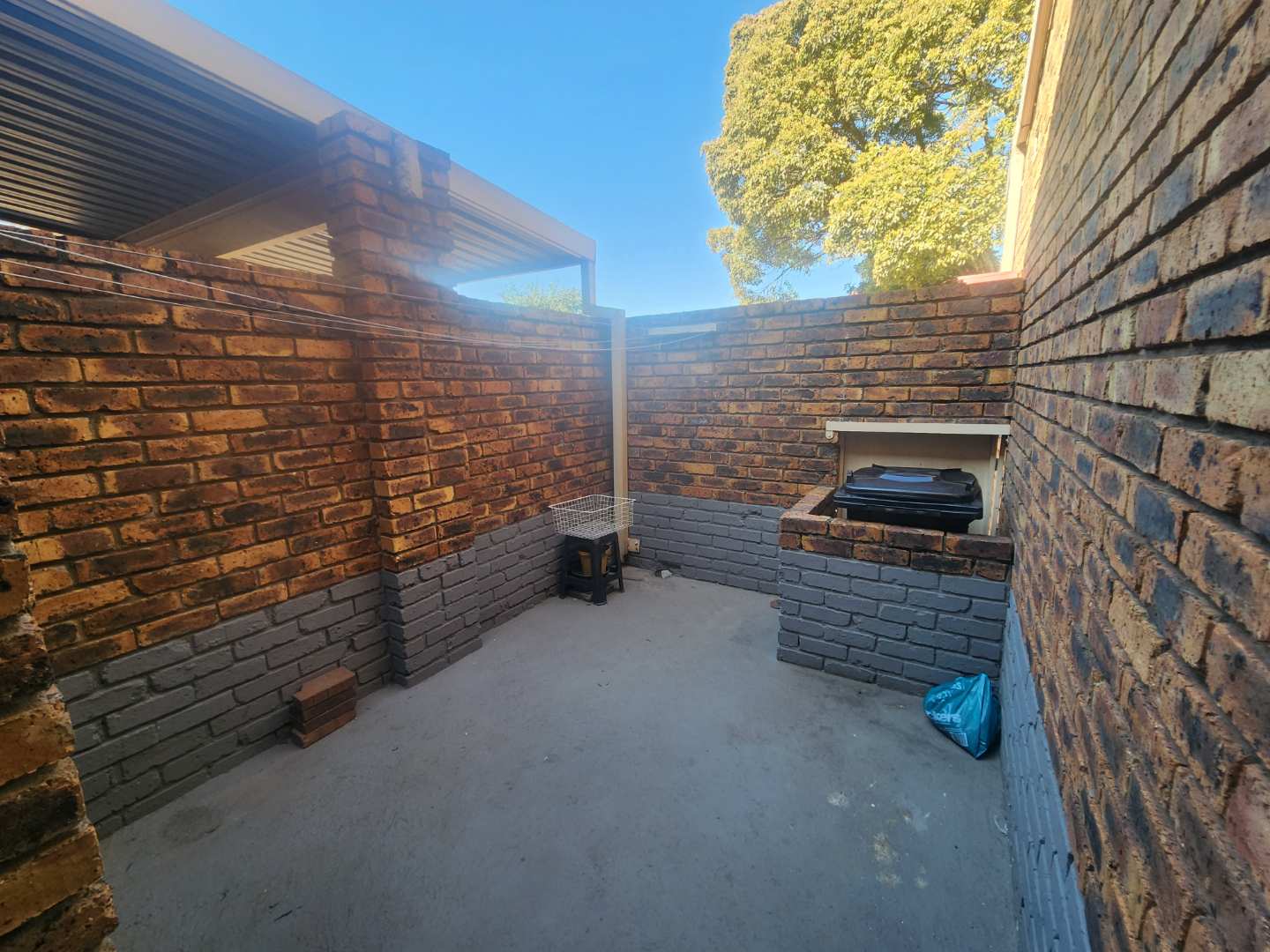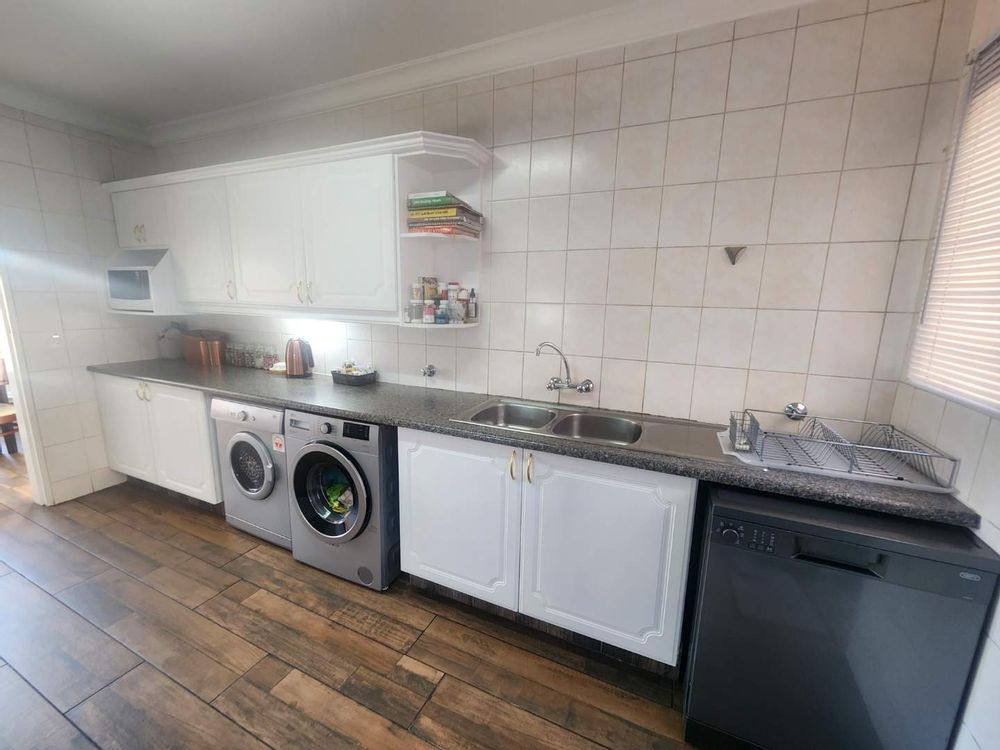 A Spacious kitchen, with ample cupboard space, an electric oven and stove, with enough space for a dishwasher, tumble dryer, and front-loading washing machine. Leading out from the kitchen is your washing line area.
