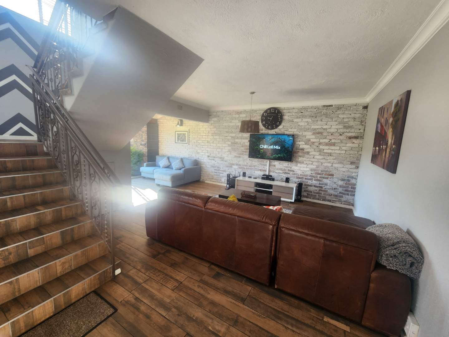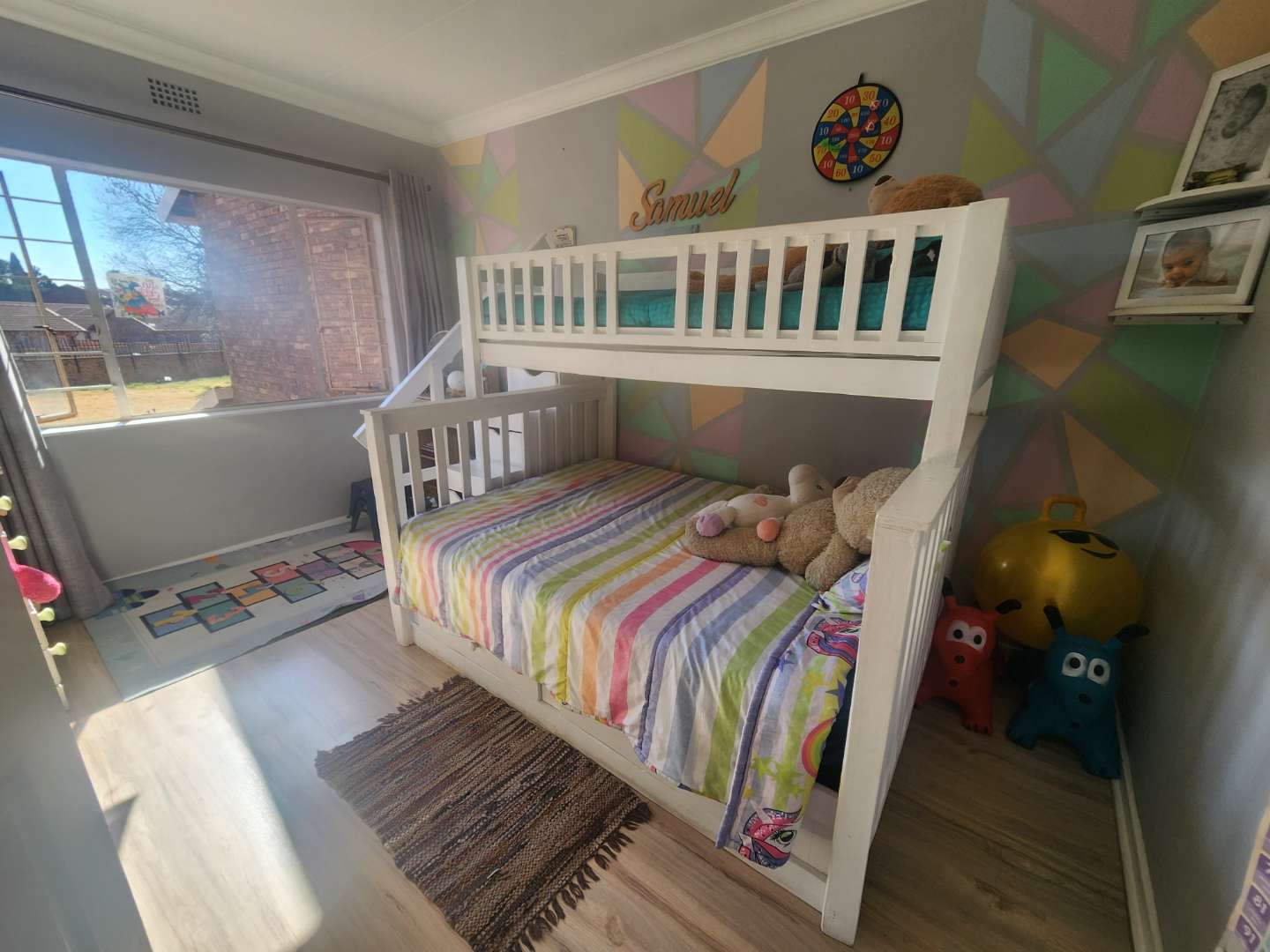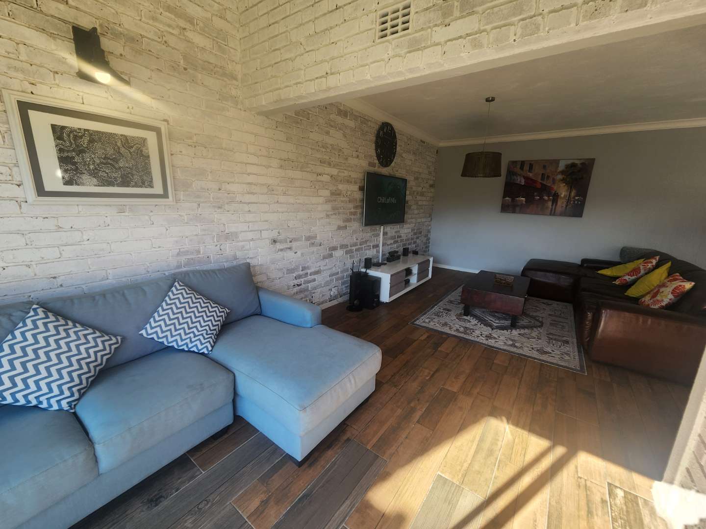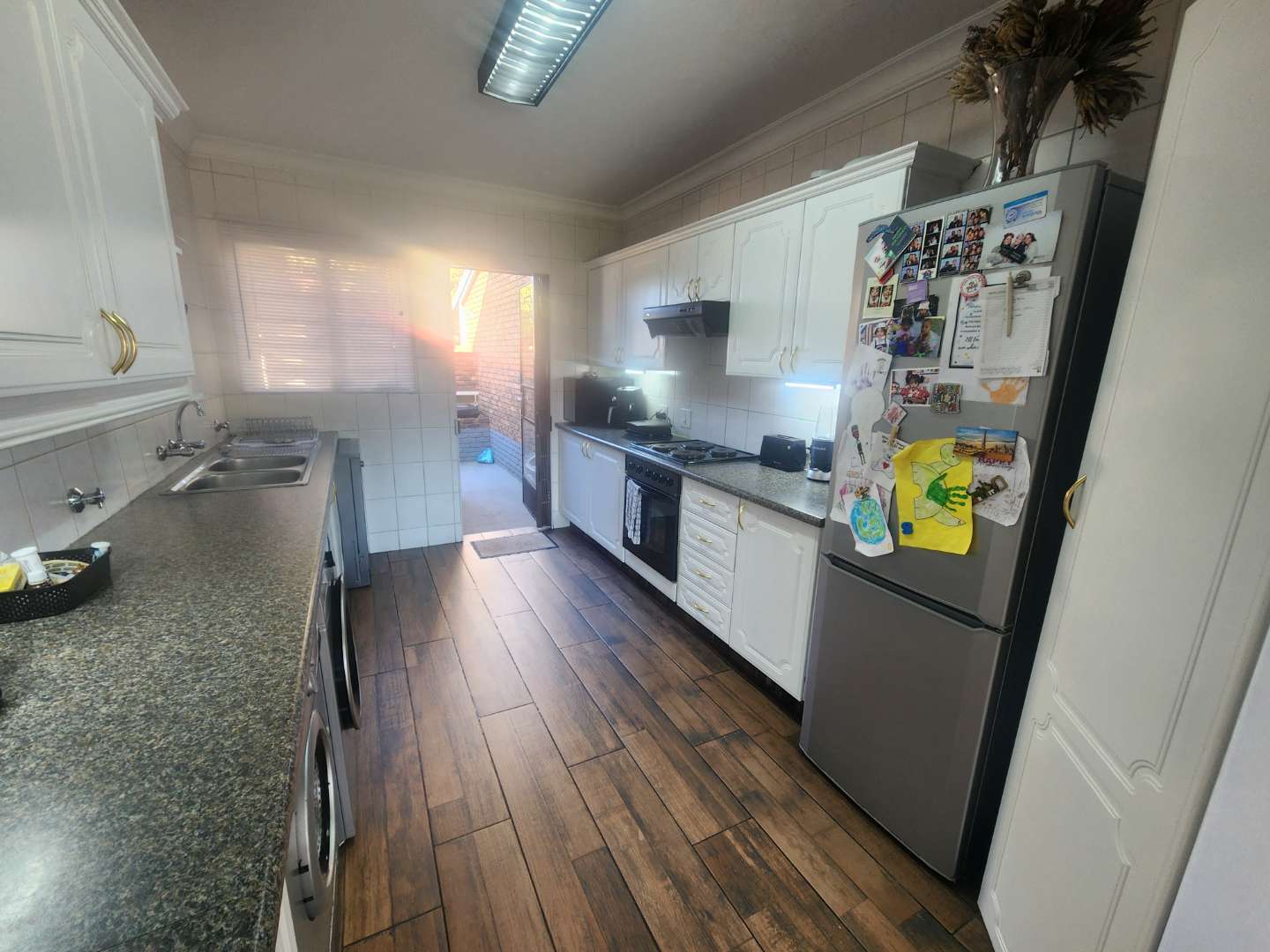 The open plan design for the lounge and dining area has loads of space for the whole family to enjoy, ample sunlight, whitewashed brick walls, and stunning floors. Leading out the sliding doors is your private backyard, easy to maintain and spacious.