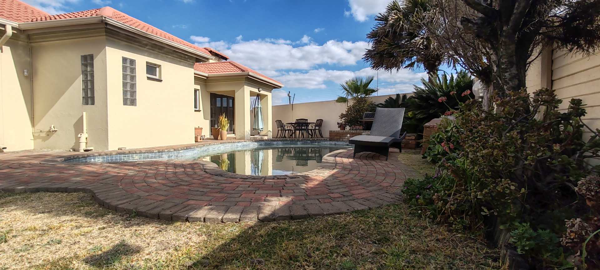 - A large, private yard featuring a sparkling swimming pool