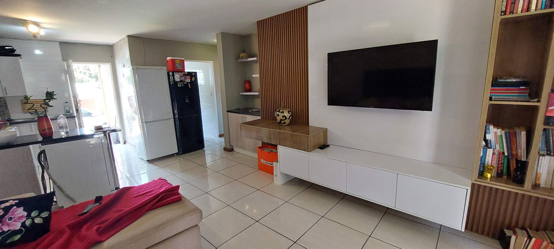 Step inside to find a spacious open-plan layout that seamlessly integrates the kitchen, dining, and lounge areas. The lounge is enhanced with a built-in TV wall unit, providing a modern touch and maximizing space efficiency. From the living area, step out onto your private patio, which can be semi-closed off for added privacy or left open to enjoy the fresh air.