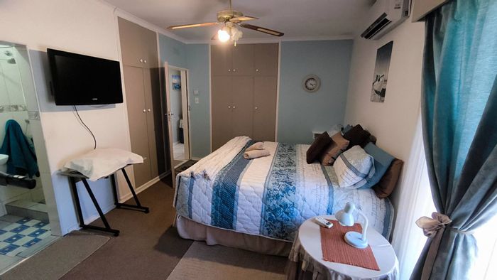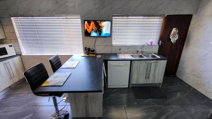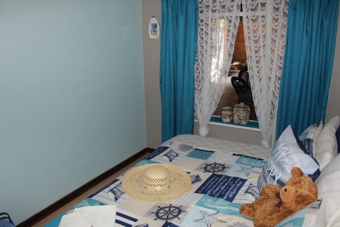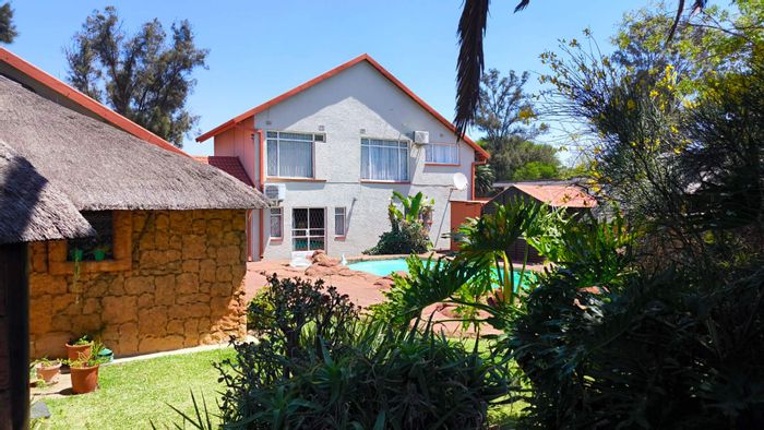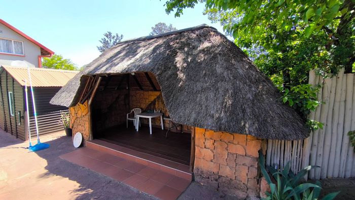 Entertainers' private garden oasis with thatched lapa and pool, plus enclosed braai area with shower. Cozy fireplace lounge, movable-island kitchen, spacious 4-car garage, three bedrooms.