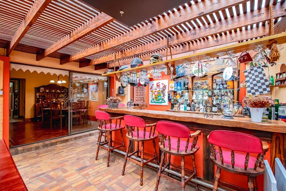 Solid wooden bar in a large enclosed entertainment room with indoor braai and space for a pool table, all overlooking the manicured garden.