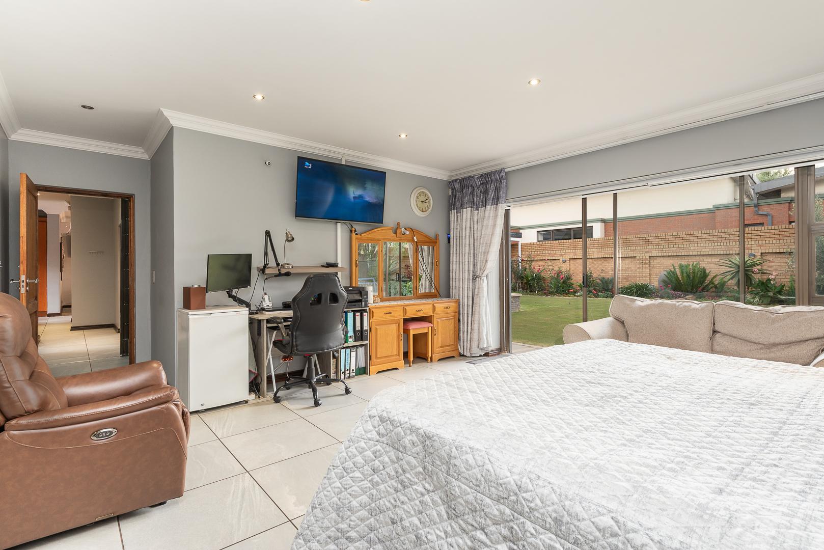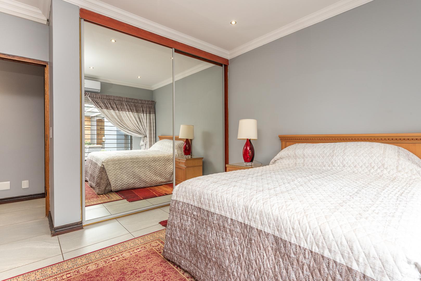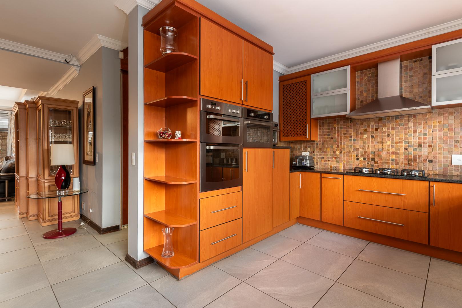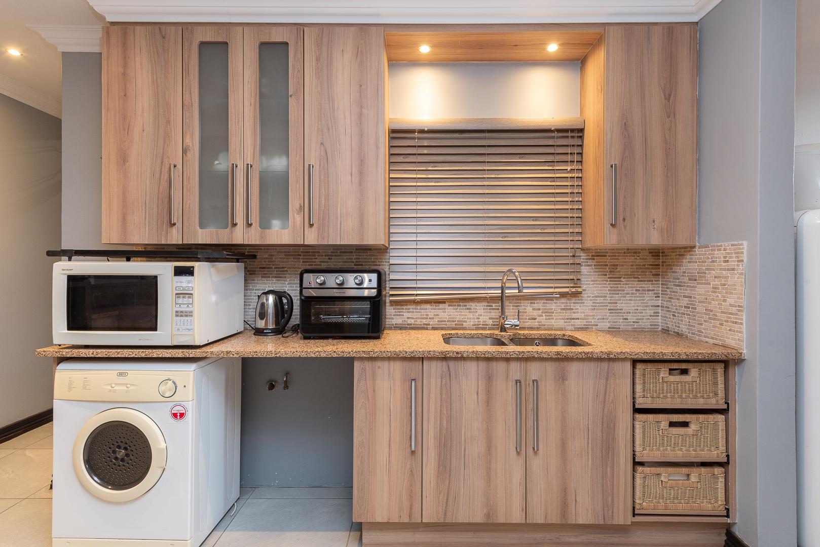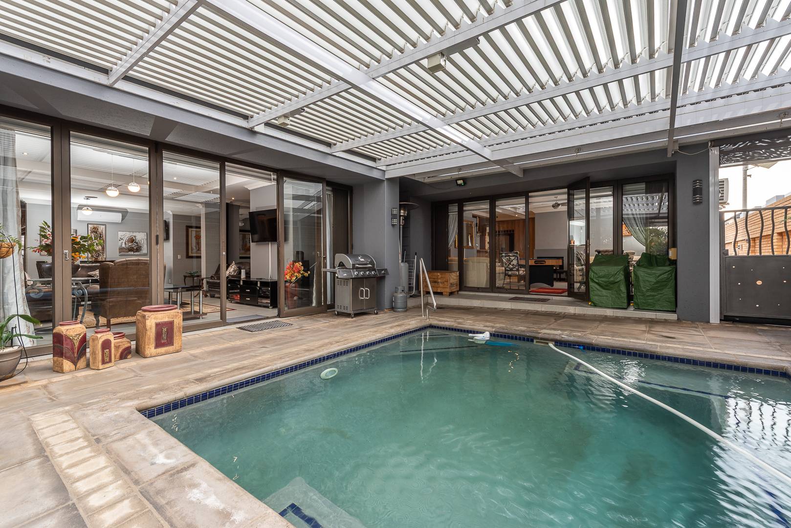 A self-contained flatlet enhances the property's appeal, with its own private entrance as wel as internal access to the main residence. It features an open-plan lounge with a gas fireplace, aluminum stacking doors to the pool and garden, and a double-sized bedroom with an en-suite modern bathroom. The ultra-modern kitchen, equipped with granite tops, a microwave, eye-level oven, and both gas and electric stoves, ensures culinary delight.