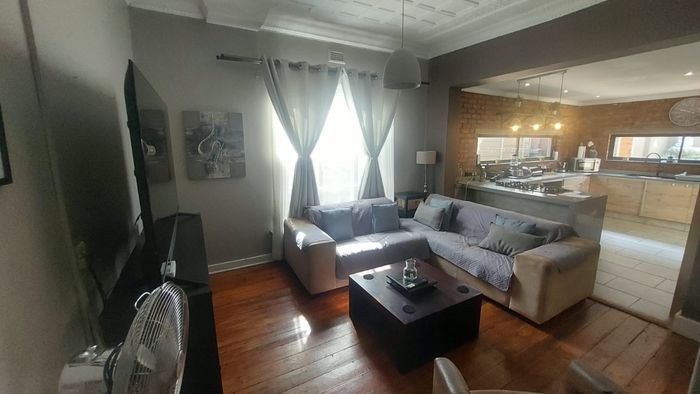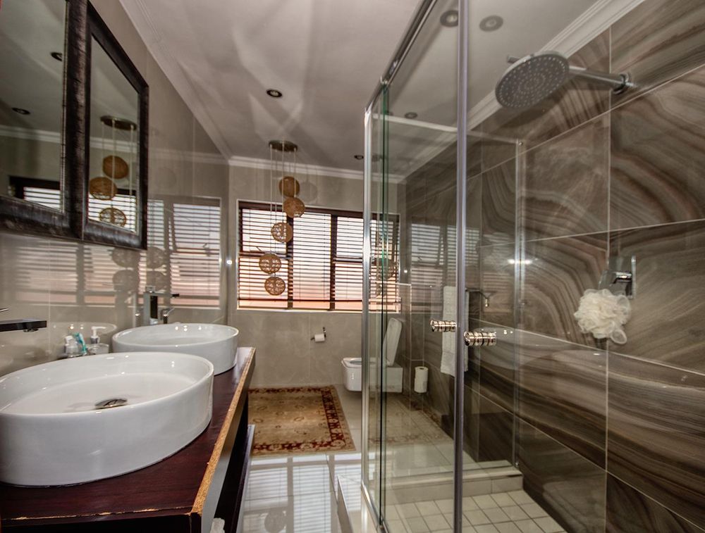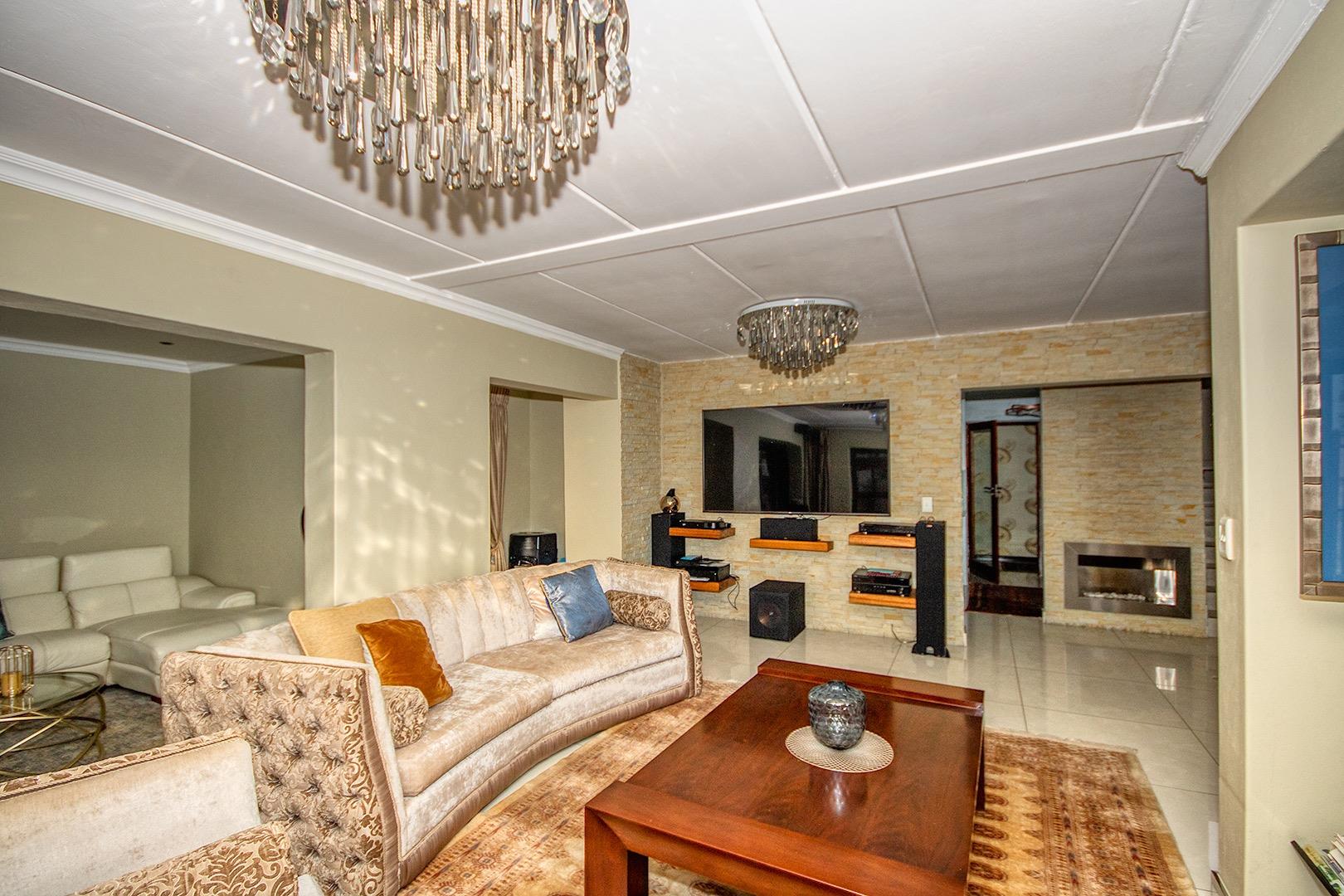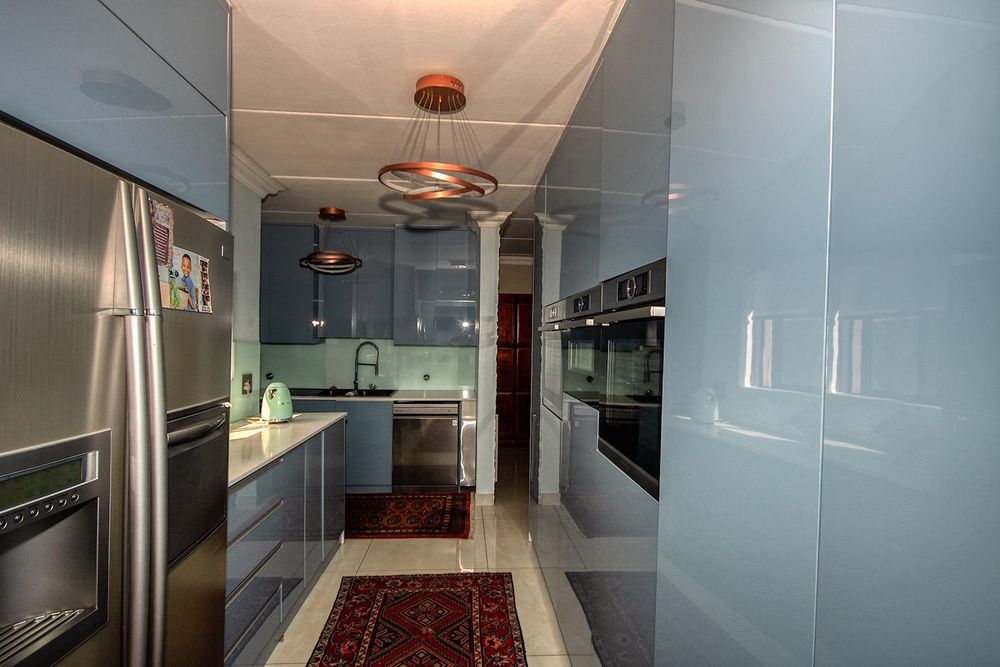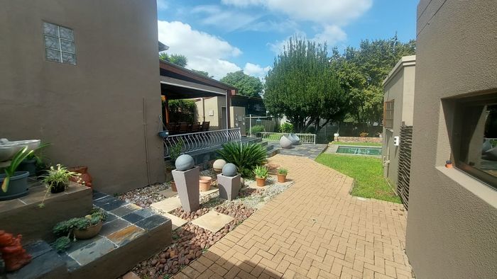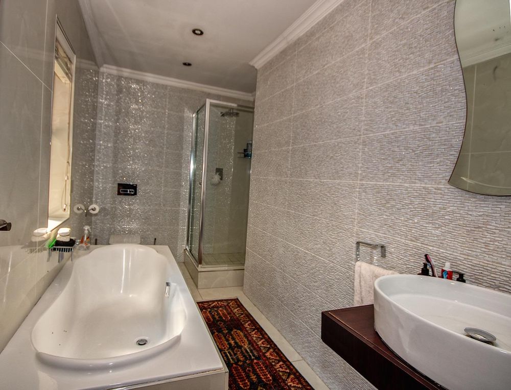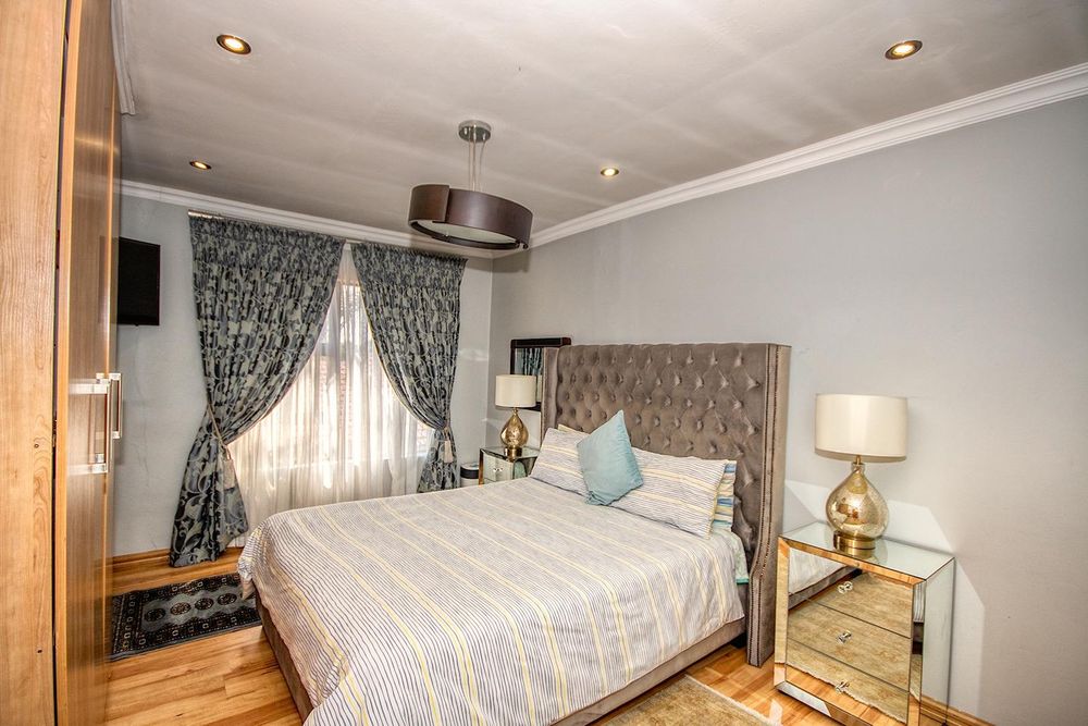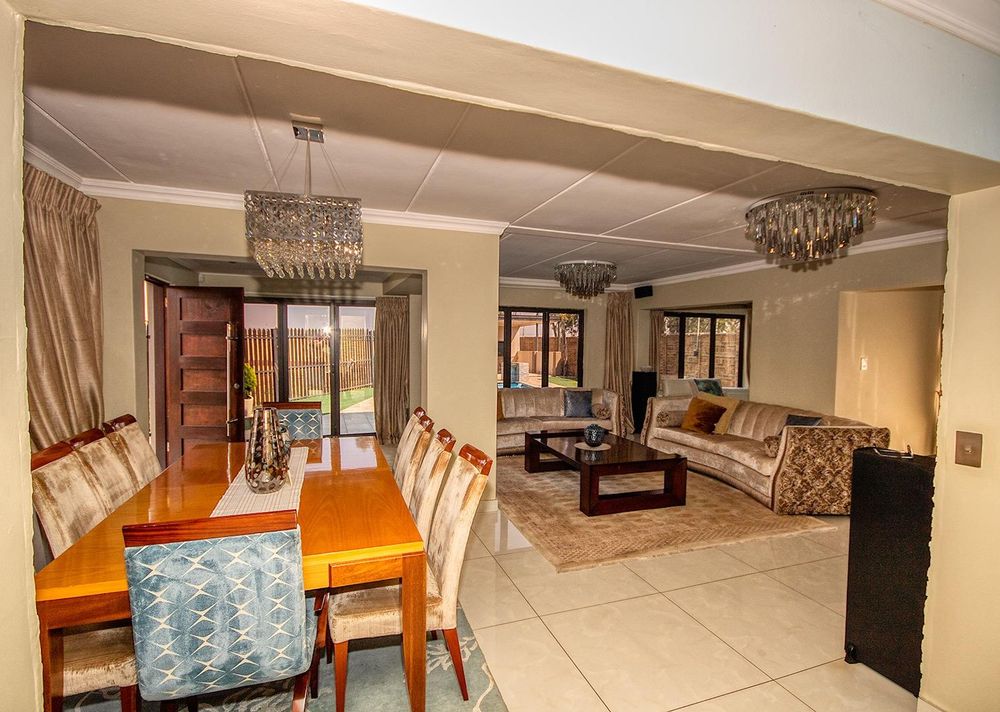 For the entertainer, this modern property welcomes you to an open-plan reception area, 2 lounges with a gas fireplace, a corner office space, porcelain tiles throughout the house, 3 foldable sliding doors leading to the private fountain pool and gas/wood brass fitted lapa, a 10 seater dining table space, all with high ceilings and a glossy blue-green modern chef's kitchen offering 2 eye-level ovens, 1 fitted microwave, a 5 plate gas stove with a modern hood and ample cupboard space. A guest powder room and enclosed garages.
