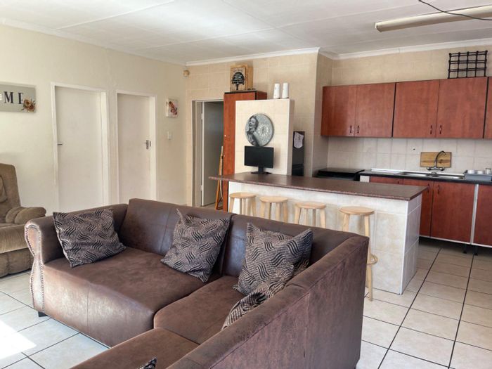 Additional amenities include a double garage for secure parking and a built-in braai area perfect for hosting gatherings. Step outside to a paved back area featuring a pristine swimming pool, creating an idyllic setting for outdoor relaxation and entertainment.