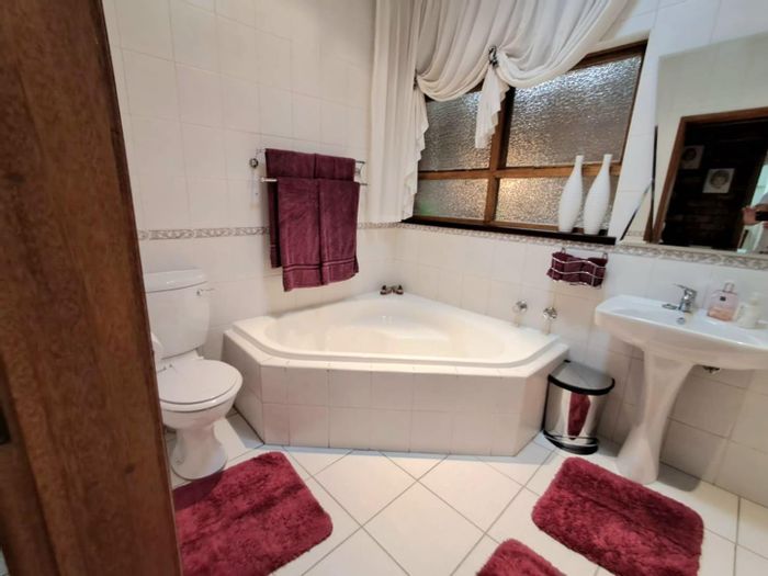 Entertain effortlessly in Mulbarton’s leafy suburb with a private outdoor paradise — pool, lapa, jacuzzi, bar and large garden with jungle gym. Five beds, four baths, double garage.