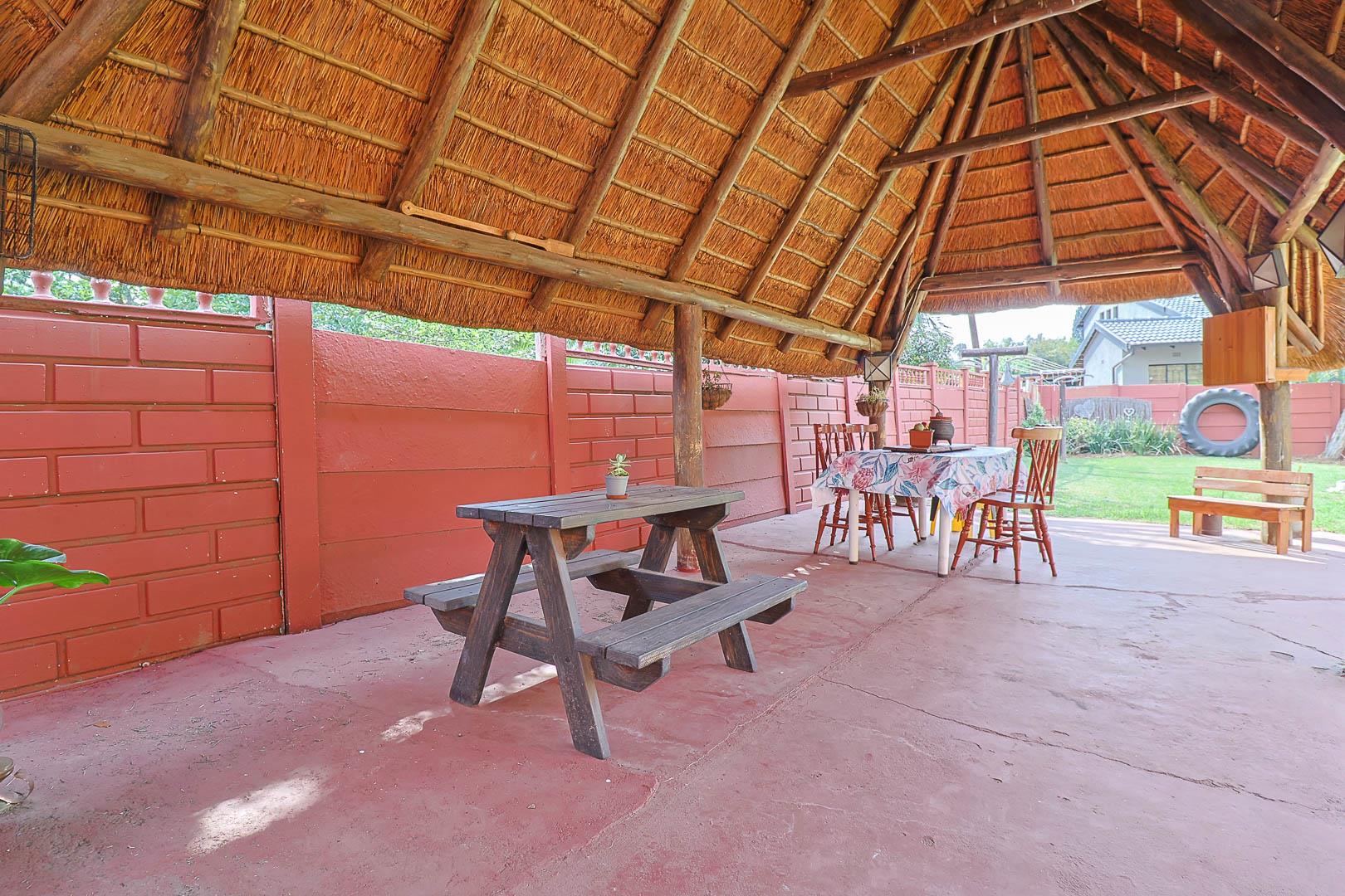 The living spaces are designed for relaxation and entertainment, including a comfortable lounge and a family room, providing plenty of space for everyone to unwind. The outdoor area is equally impressive, featuring a beautiful garden and a thatch lapa, perfect for enjoying outdoor meals or hosting summer barbecues.