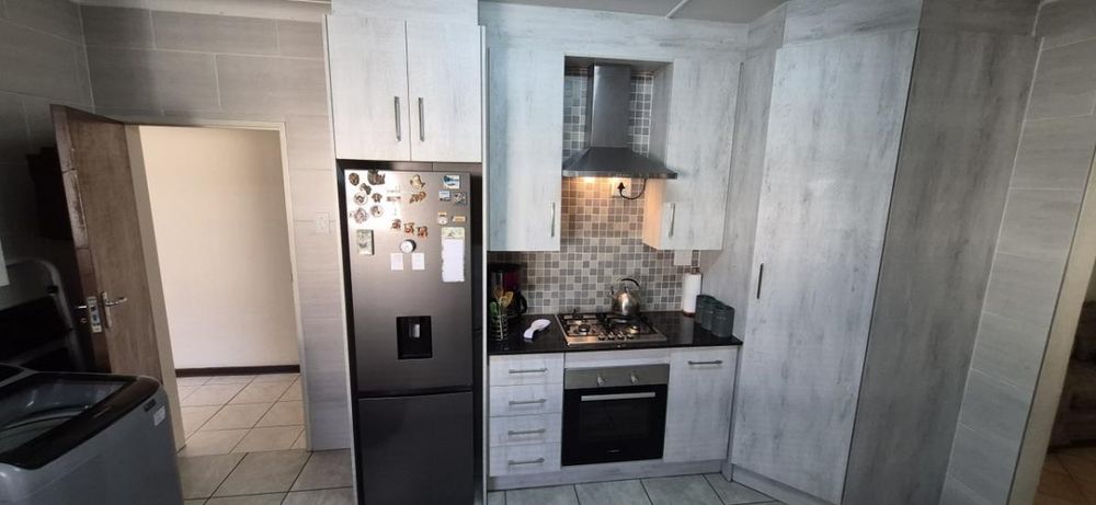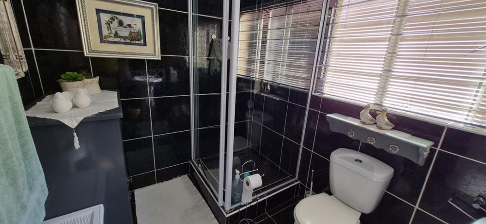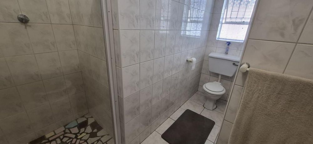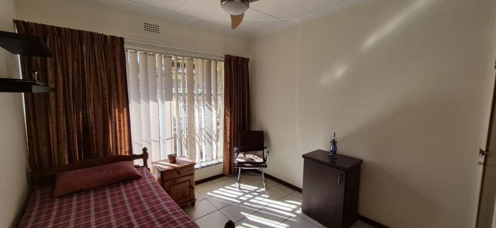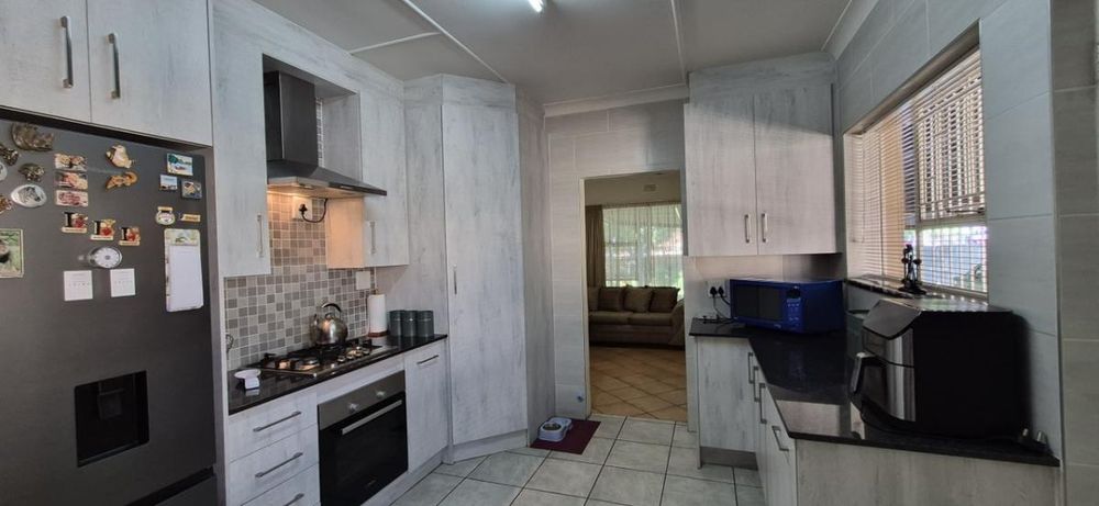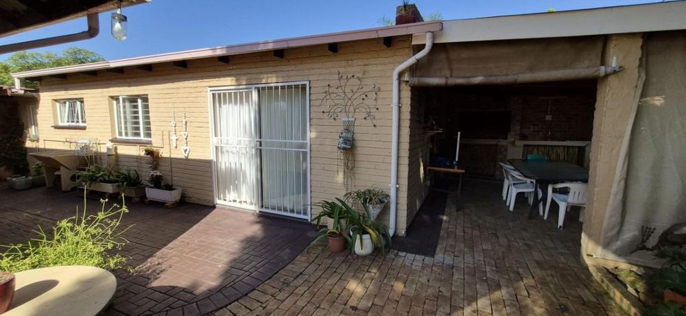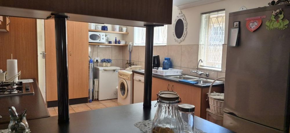 The property includes a separate granny flat offering its own lounge and dining area. The spacious beechwood kitchen features Formica countertops and built-in cupboards. The flat comprises one tiled bedroom with a sliding door for easy access.