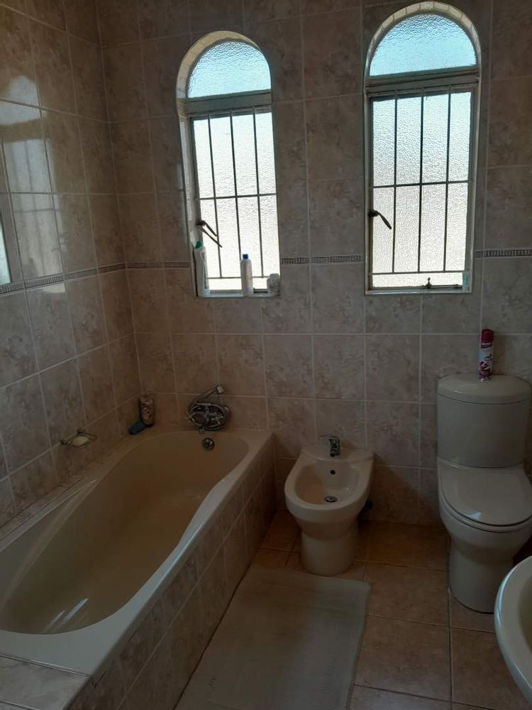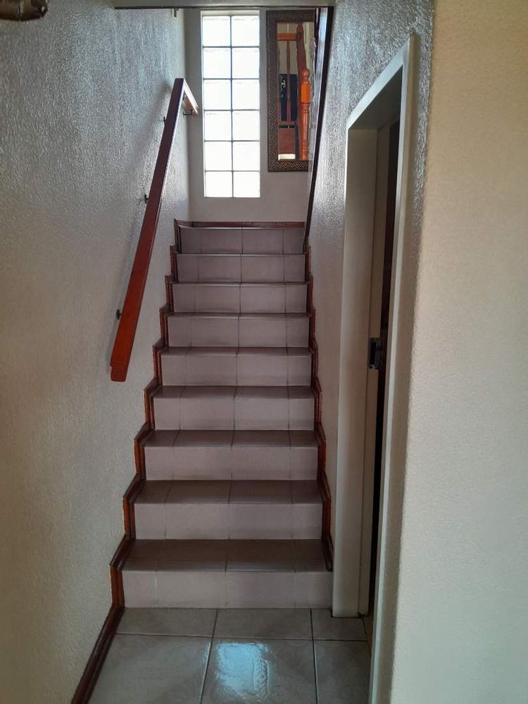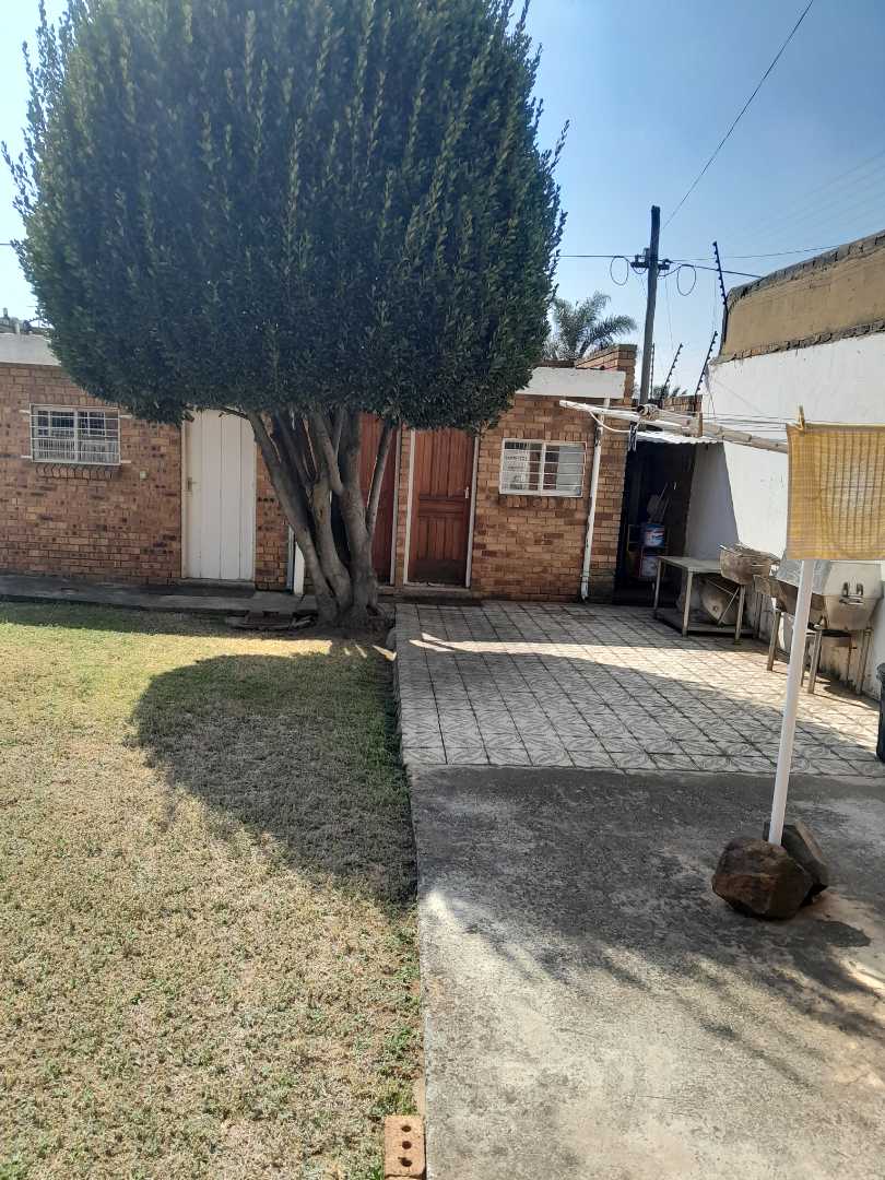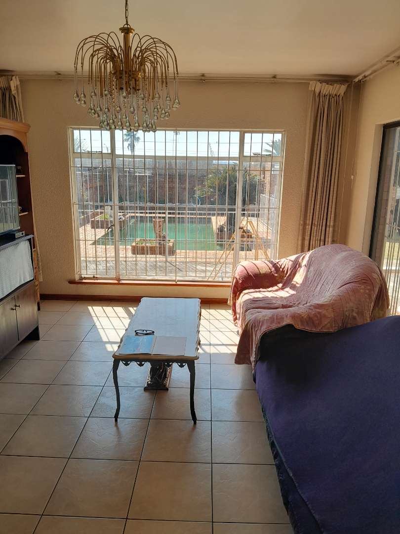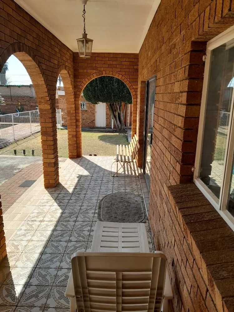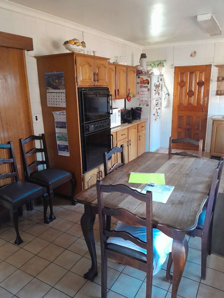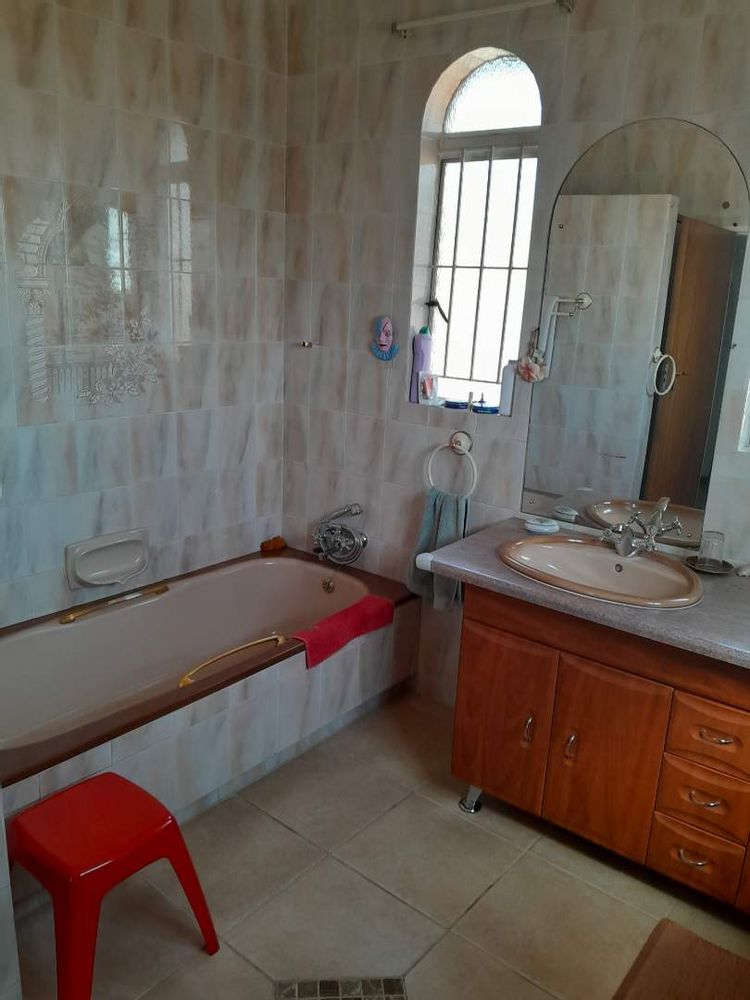 The exterior of this property is designed with practicality in mind. A double garage allows drive-through access to additional open parking space, ensuring ample room for multiple vehicles. The backyard is an oasis of relaxation with its sparkling swimming pool, perfect for cooling off during warm days. Additional amenities include 2 storerooms or servant quarters with an outside toilet, providing extra storage or accommodation options.