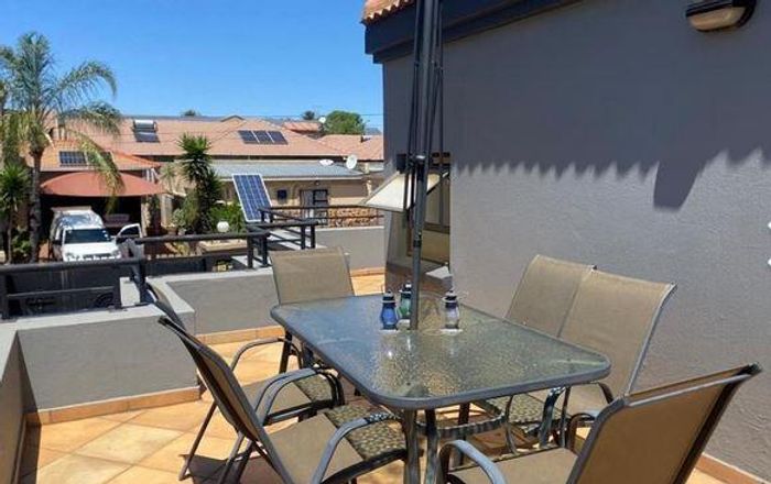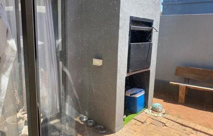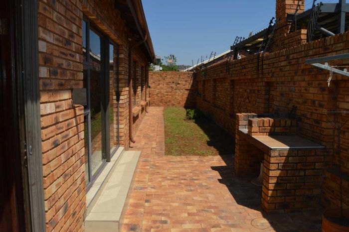 Low-maintenance face-brick simplex in secure New Redruth complex, open-plan living and modern kitchen flowing to enclosed patio with built-in braai, solar panels, garage and carport — 3 beds, 2 baths.
