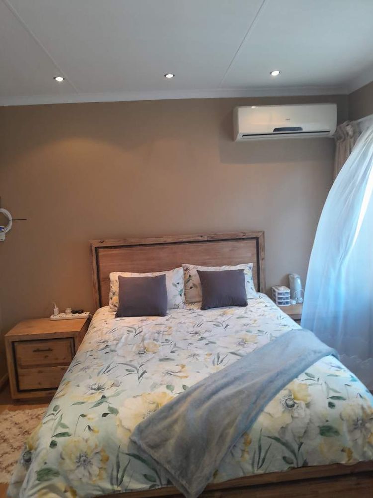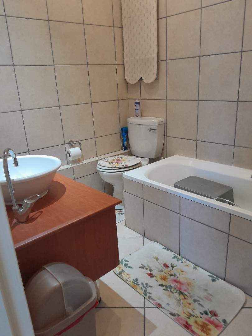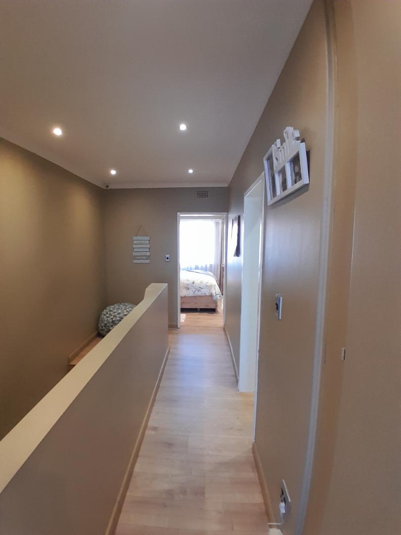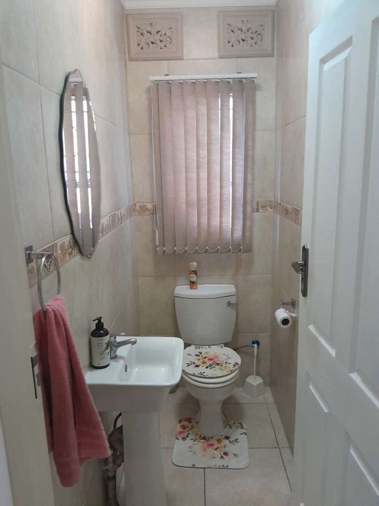 Ascend to the upper level, where you will find 2 generously sized bedrooms, each adorned with elegant laminated flooring and equipped with built-in cupboards. The master bedroom boasts an en-suite bathroom with a bath, toilet, and basin, all beautifully tiled. The 2nd bathroom is equally stylish, featuring a shower, toilet, and basin.