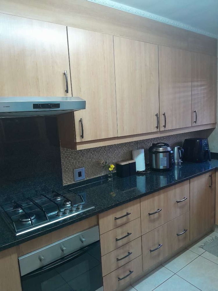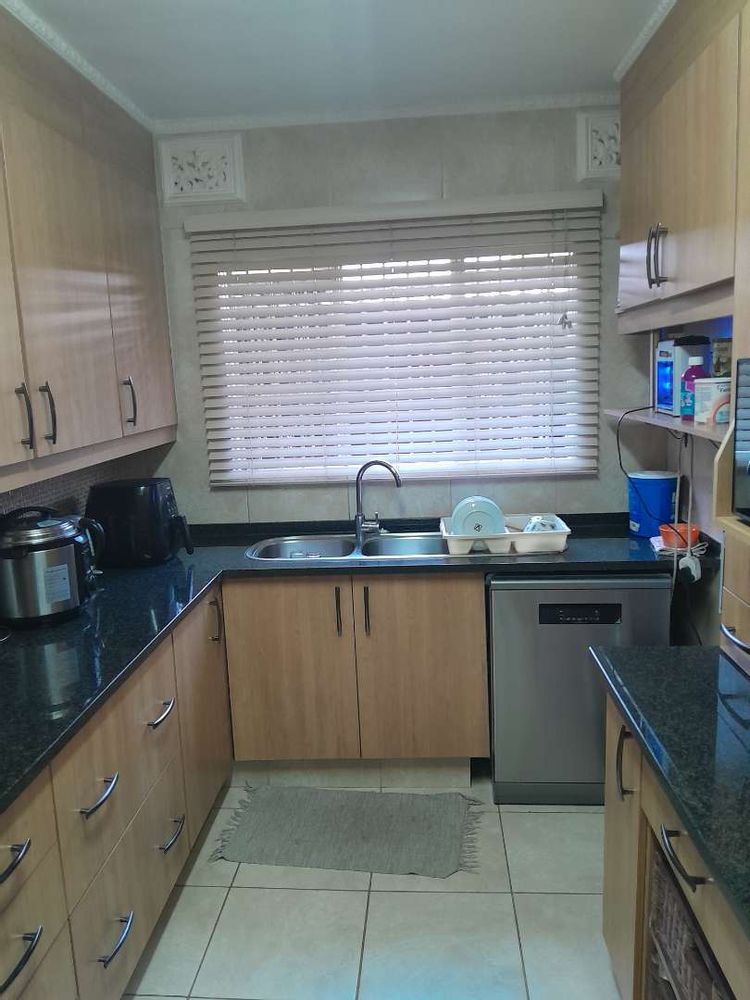 Step into a neat and spacious open-plan lounge and dining area. The space flows seamlessly into a small enclosed patio and an inviting garden, offering a tranquil retreat. The contemporary kitchen is a chef’s delight, featuring sleek granite countertops, a gas top stove, an electric oven, and ample cupboard space for all your culinary needs. A conveniently located guest toilet completes the downstairs area.