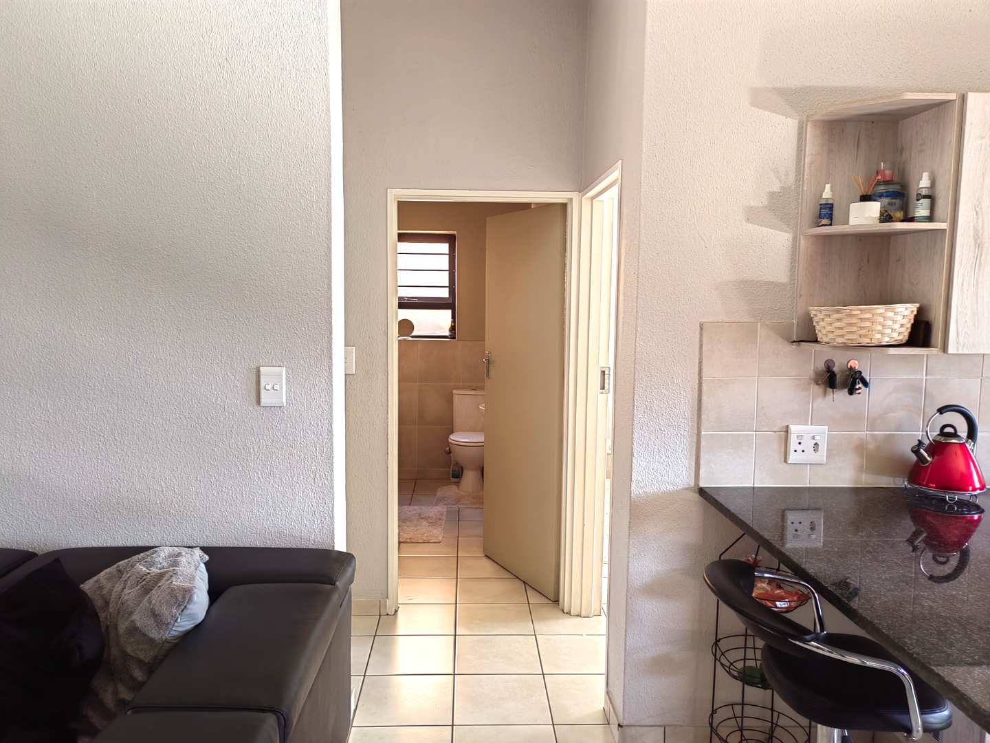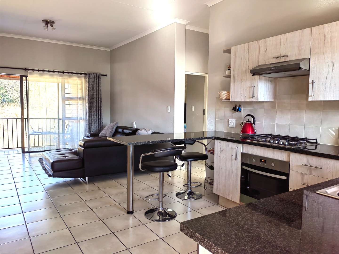 This modern home features an open-plan kitchen and lounge, with sleek countertops, ample cupboard space, and room for appliances. The living area opens onto a private balcony, ideal for morning coffee or unwinding in the evening while enjoying the beautiful elevated views.